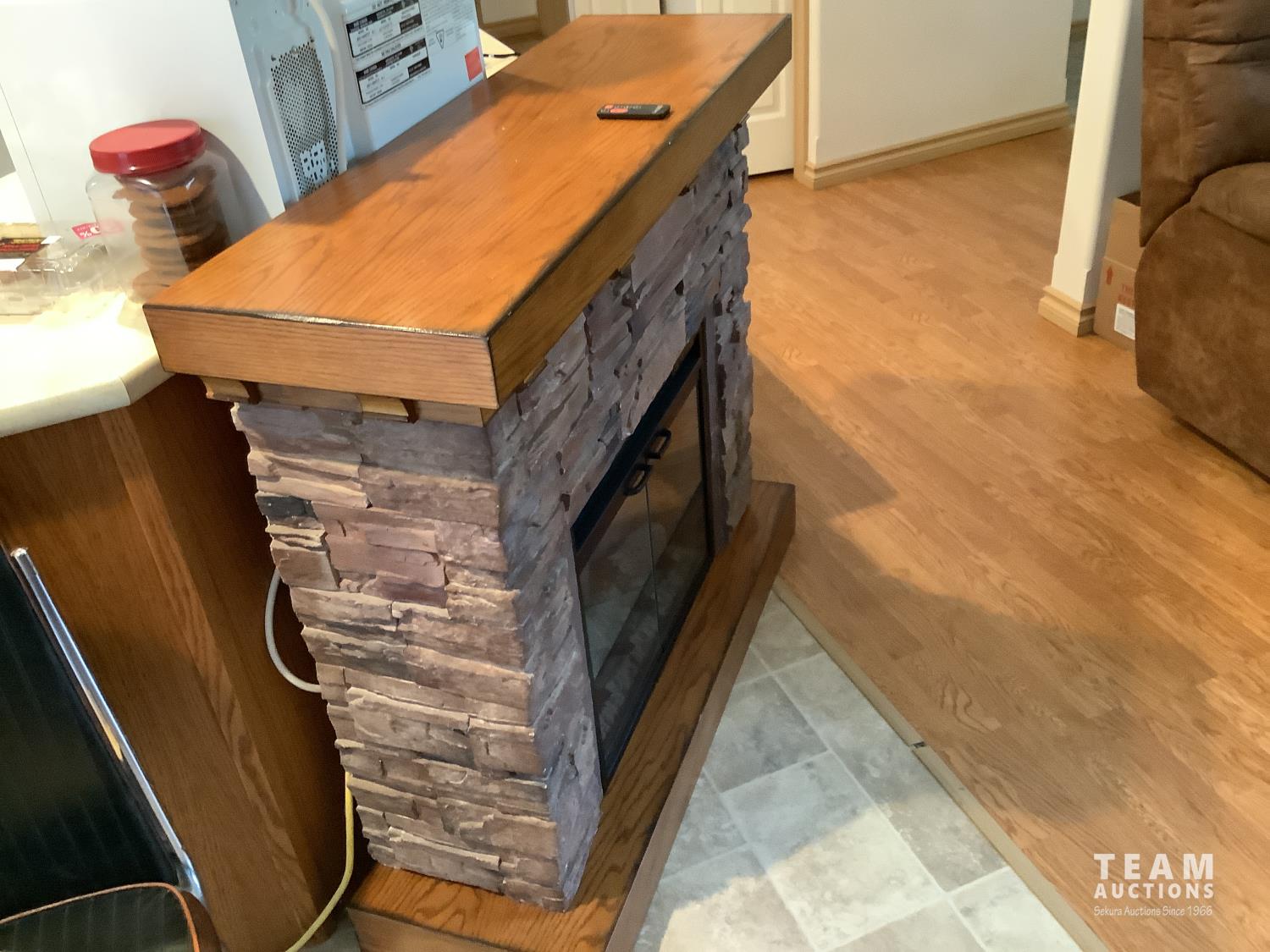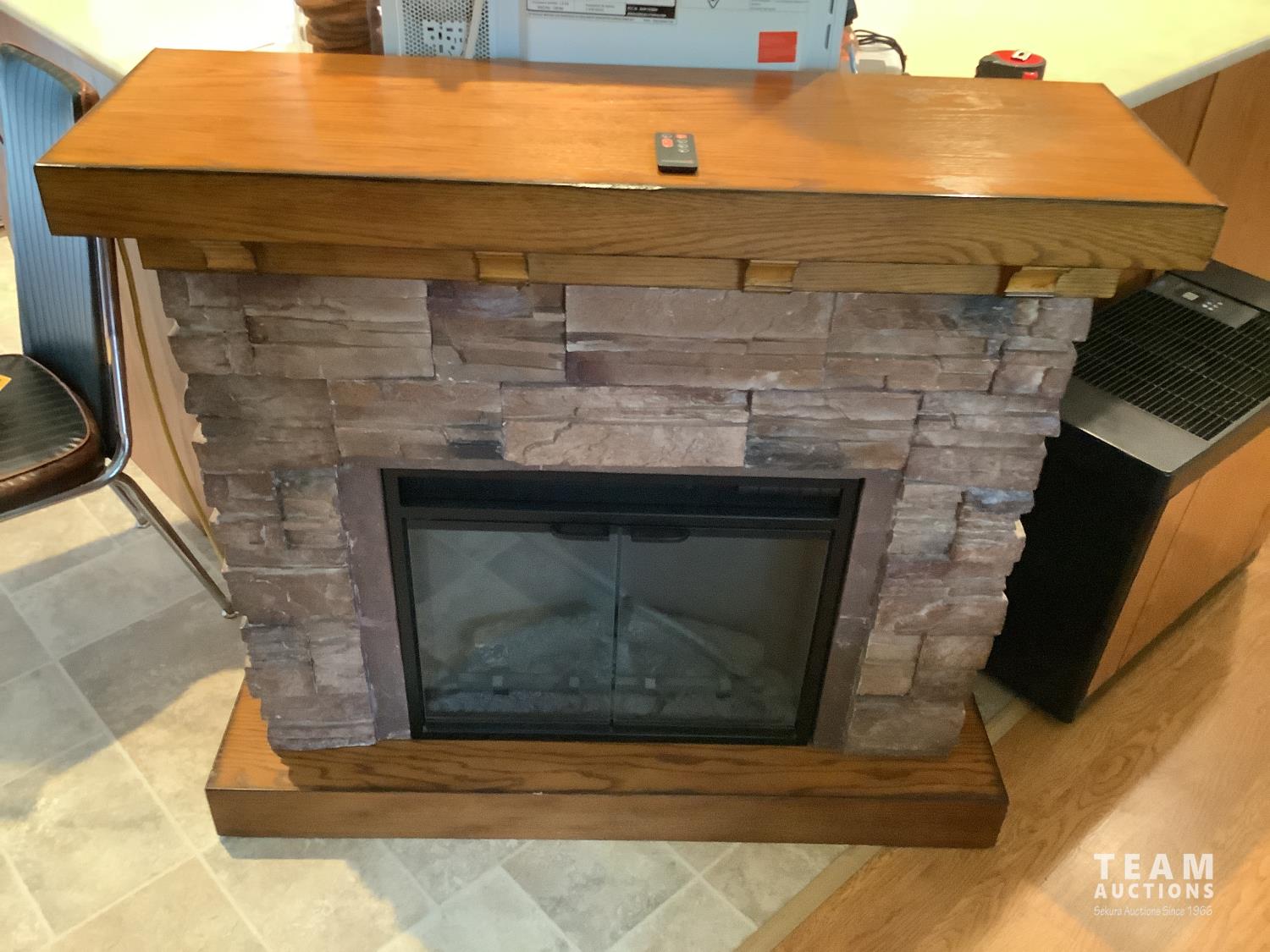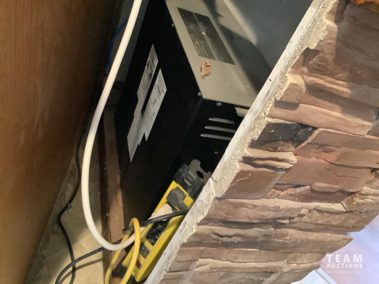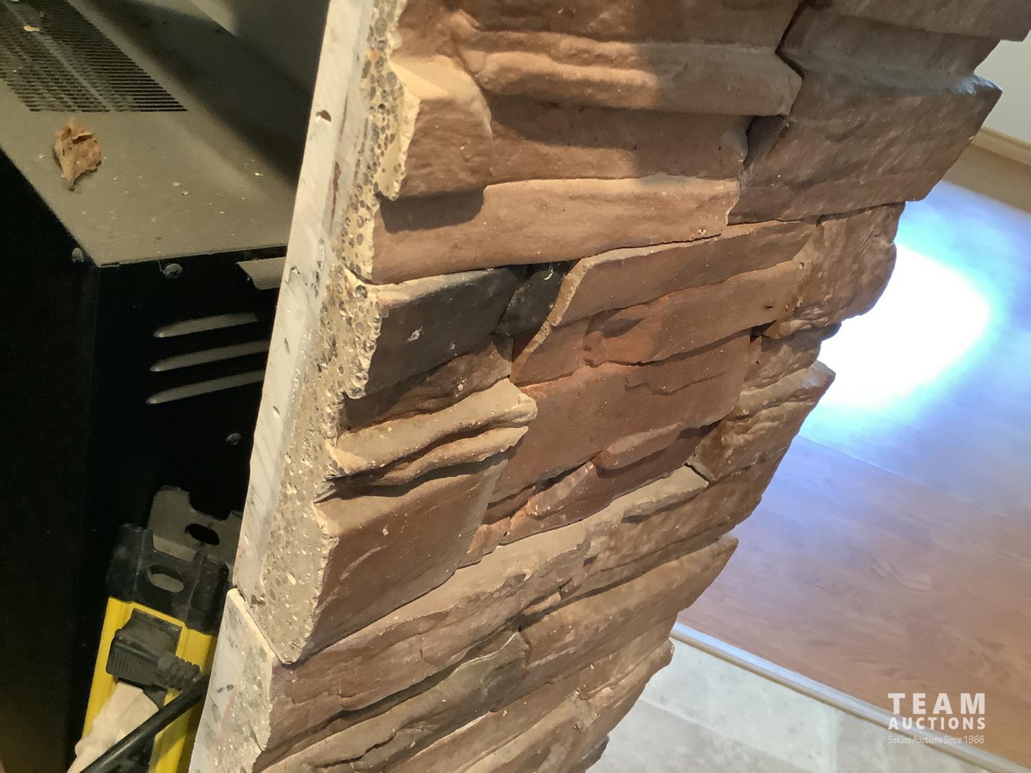110 volt, open glass doors, real rock finish, 44 inch wide, 39 inch high, 14 inch wide