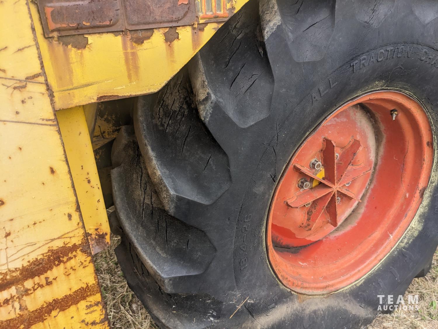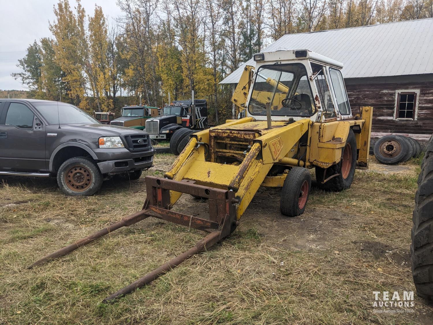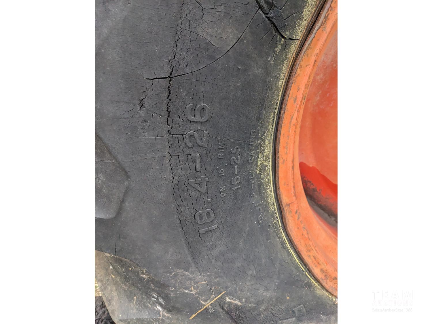 4 cylinder diesel engine, 4 speed shuttle shift transmission, cab, loader bucket, 24 inch backhoe dig bucket, bale forks, 18.4-26 rear tires