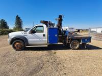 Powerstroke V8 diesel engine, electric engine block heater, 6 speed automatic transmission, A/C, radio, hydraulic wet kit, steel tool boxes, 94 inch x 76 inch deck, hoist, rub rails, stake pockets, vice holders, , hiab 060-3 3 section knuckle rear mount crane, outriggers, spring suspension, 70 CFM VMAC air compressor, electronic auxillary switches, brake controller, tow haul mode, power locks, power windows, , 225/70R19.5 tires