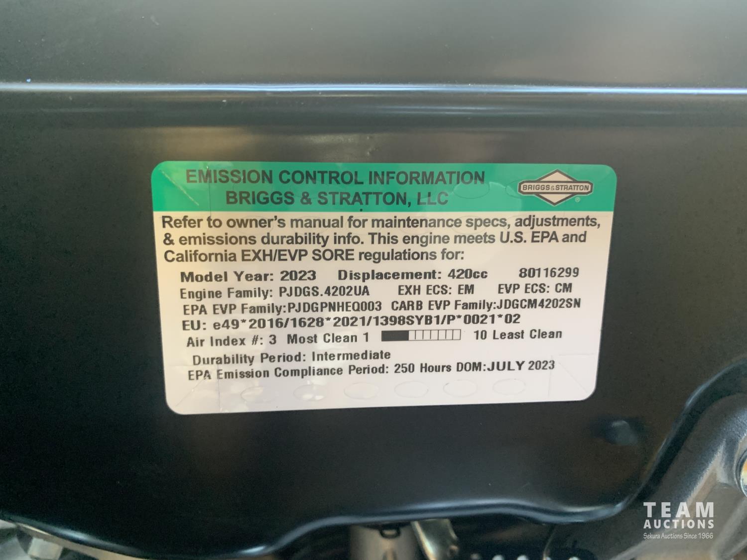Open station, pilot controls, Briggs & Stratton 13.5 HP gas engine, LED work lights, 15 inch dig bucket, manual coupler, manual thumb, 1 auxiliary hydraulics, 2 Ft 7 inch stick, swing boom, backfill blade