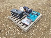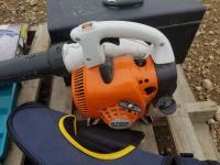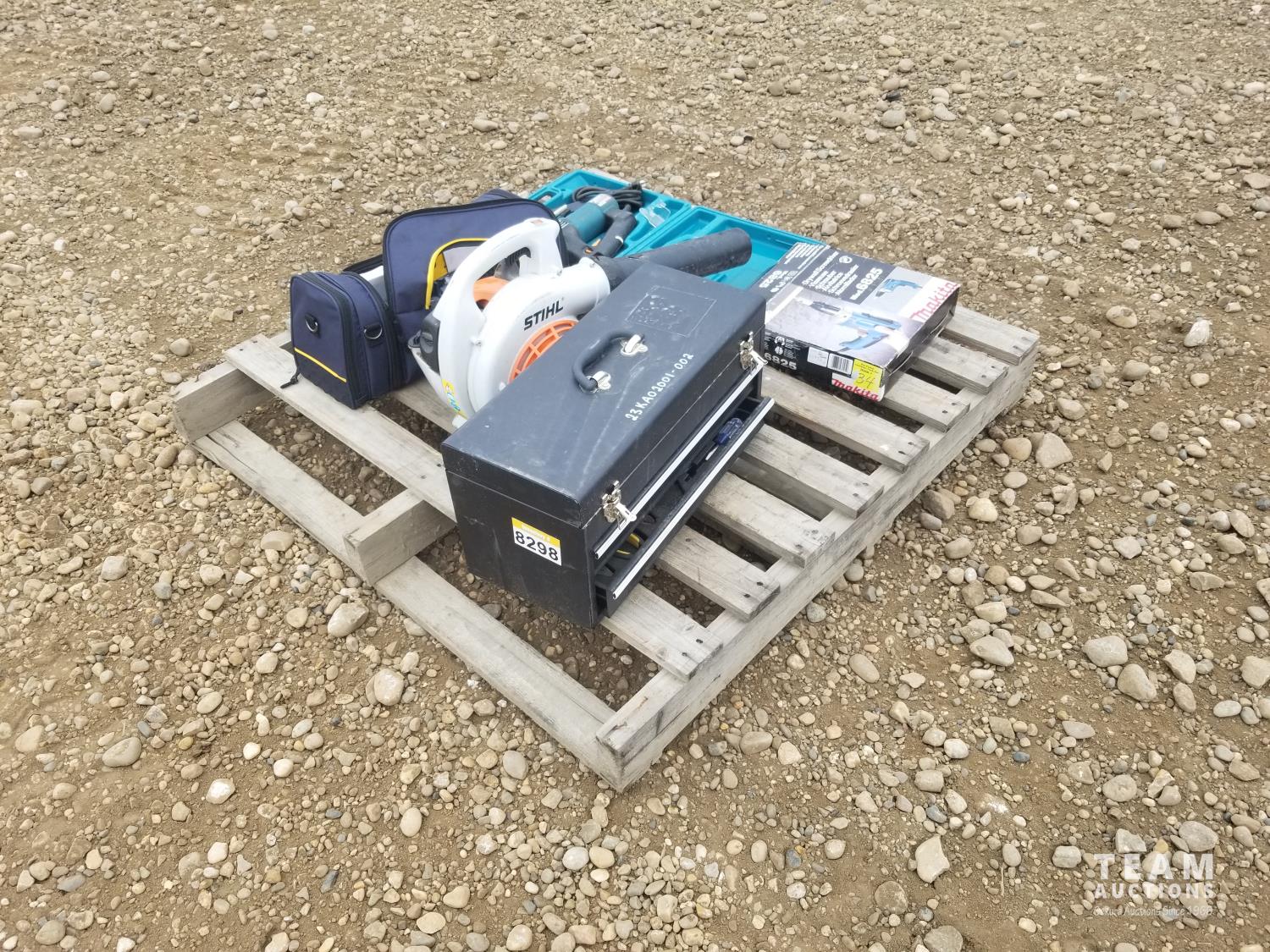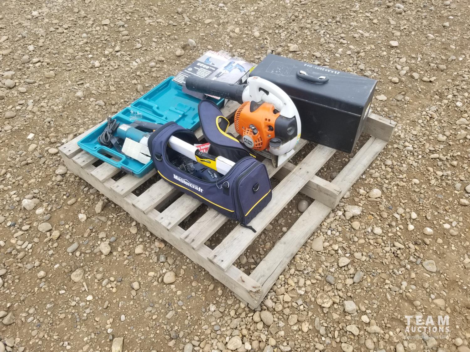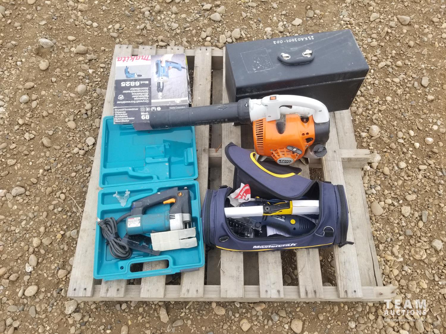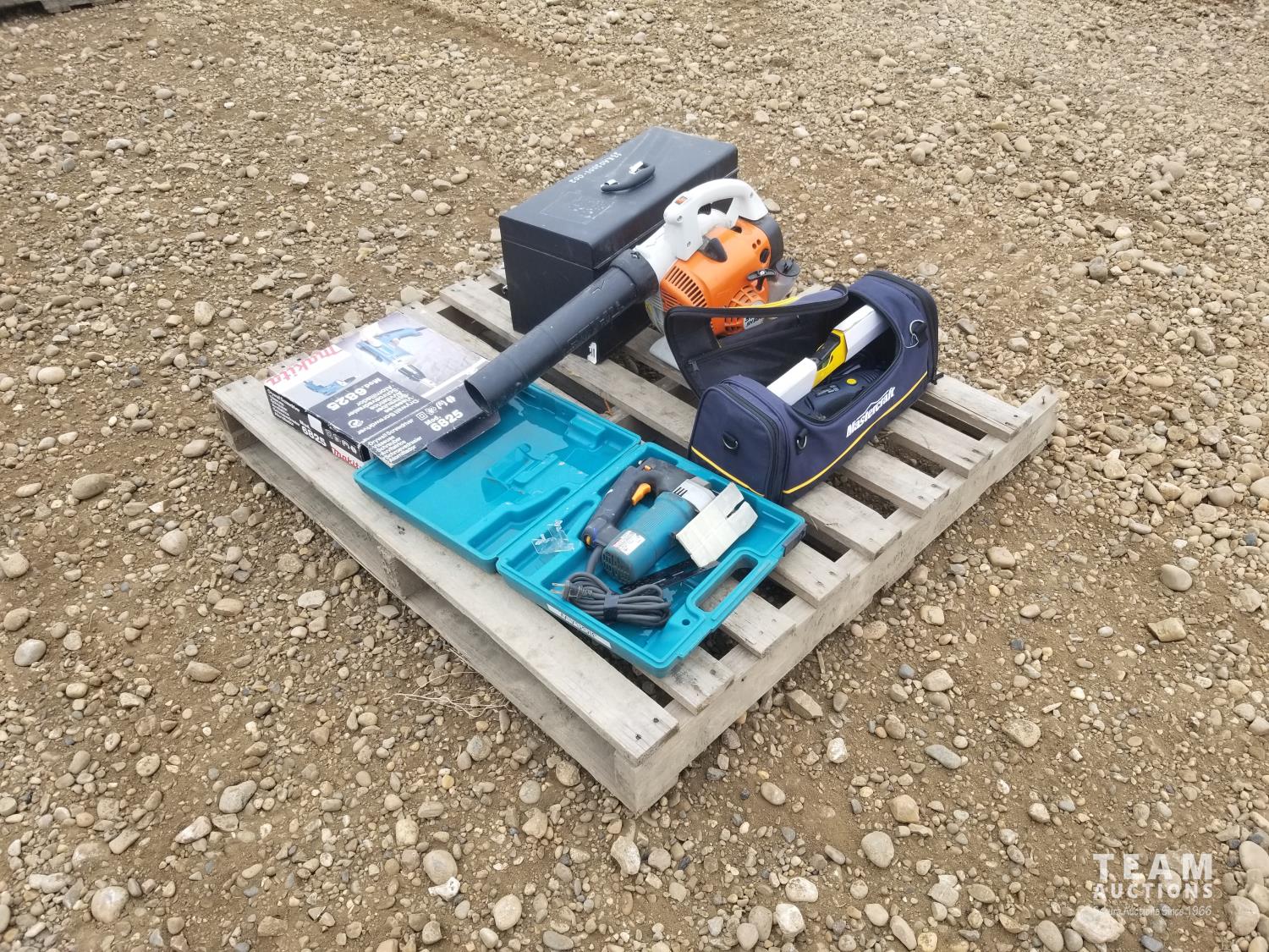 Stihl leaf blower, tool box with assortment of tools, Makita jigsaw, Makita drywall screwdriver