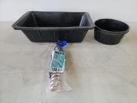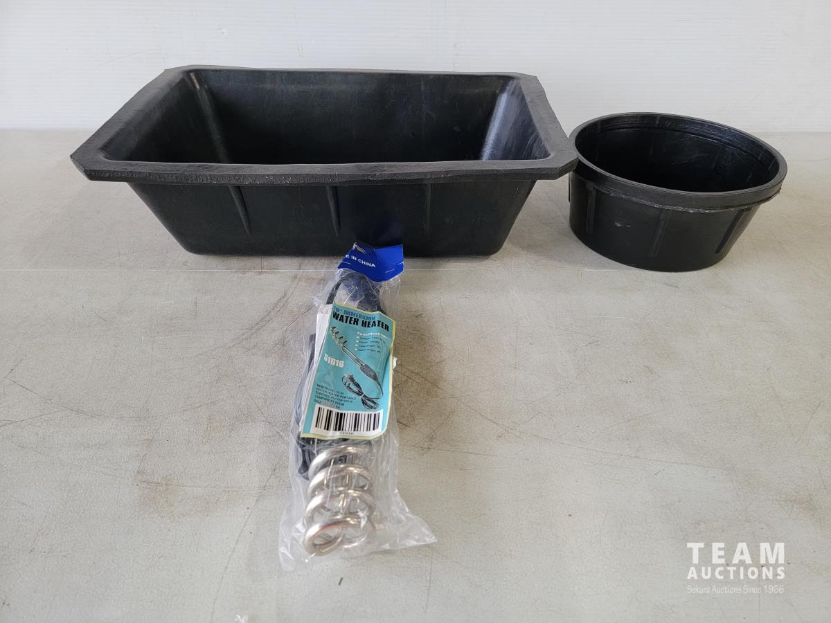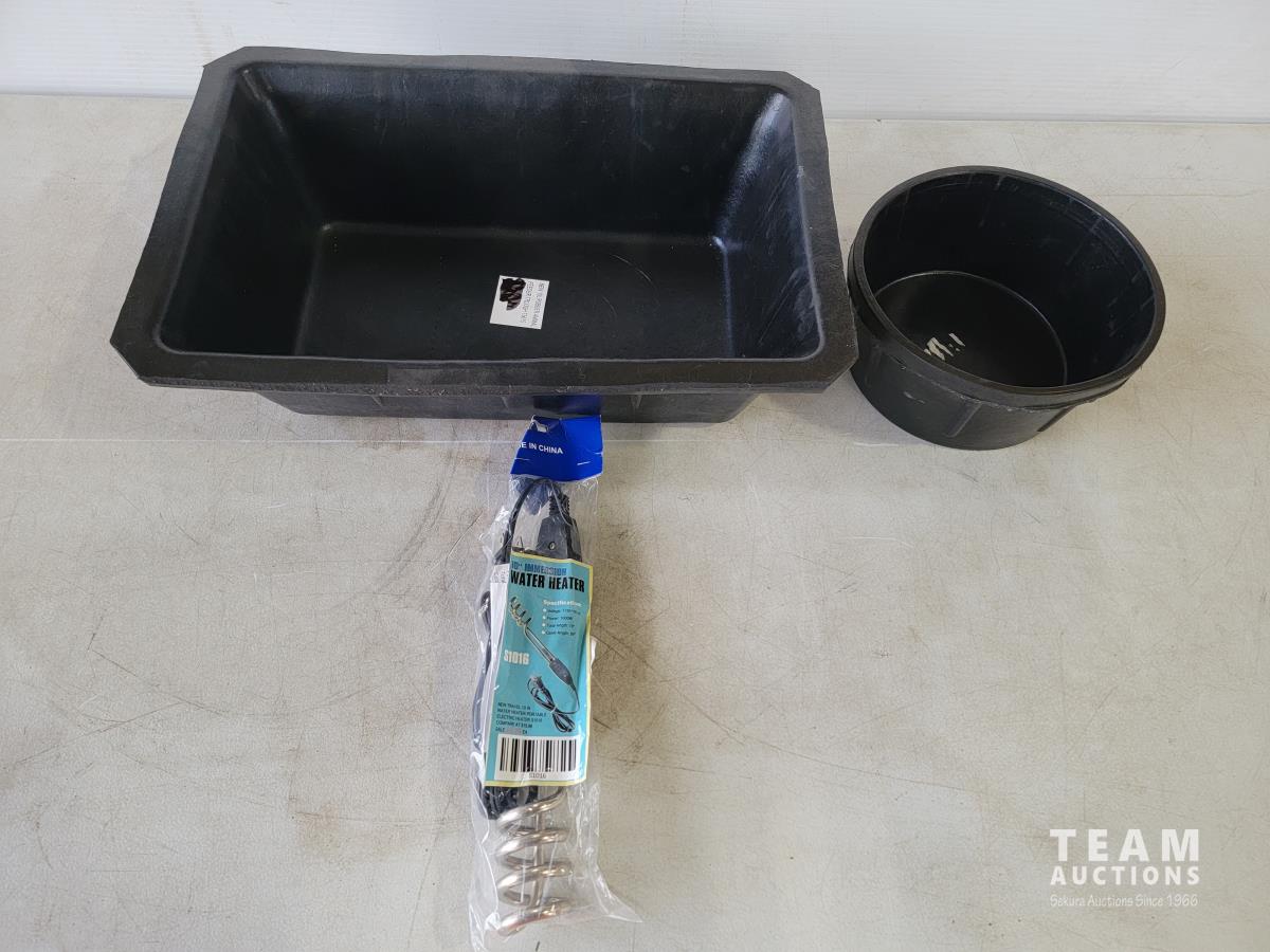 1448 10L Rubber Animal Feeder Trough, Small Rubber Round Bowl and 10 Inch Immersion Water Heater (Unused)