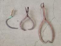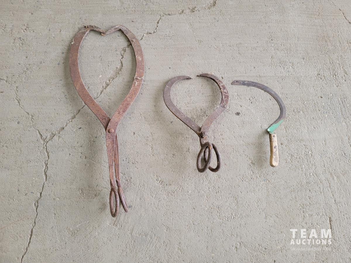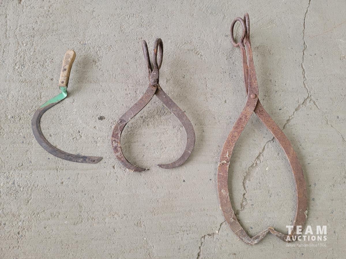 1077 (2) Antique Ice Tongs and Antique Hand Scythe Sickle