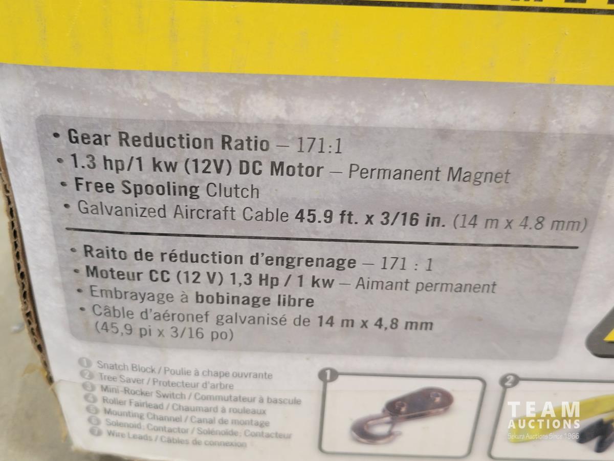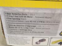 1.3 HP DC motor, 171:1 gear reduction ratio, free spooling clutch, 45.9 ft x 3/16 inch galvanized aircraft cable