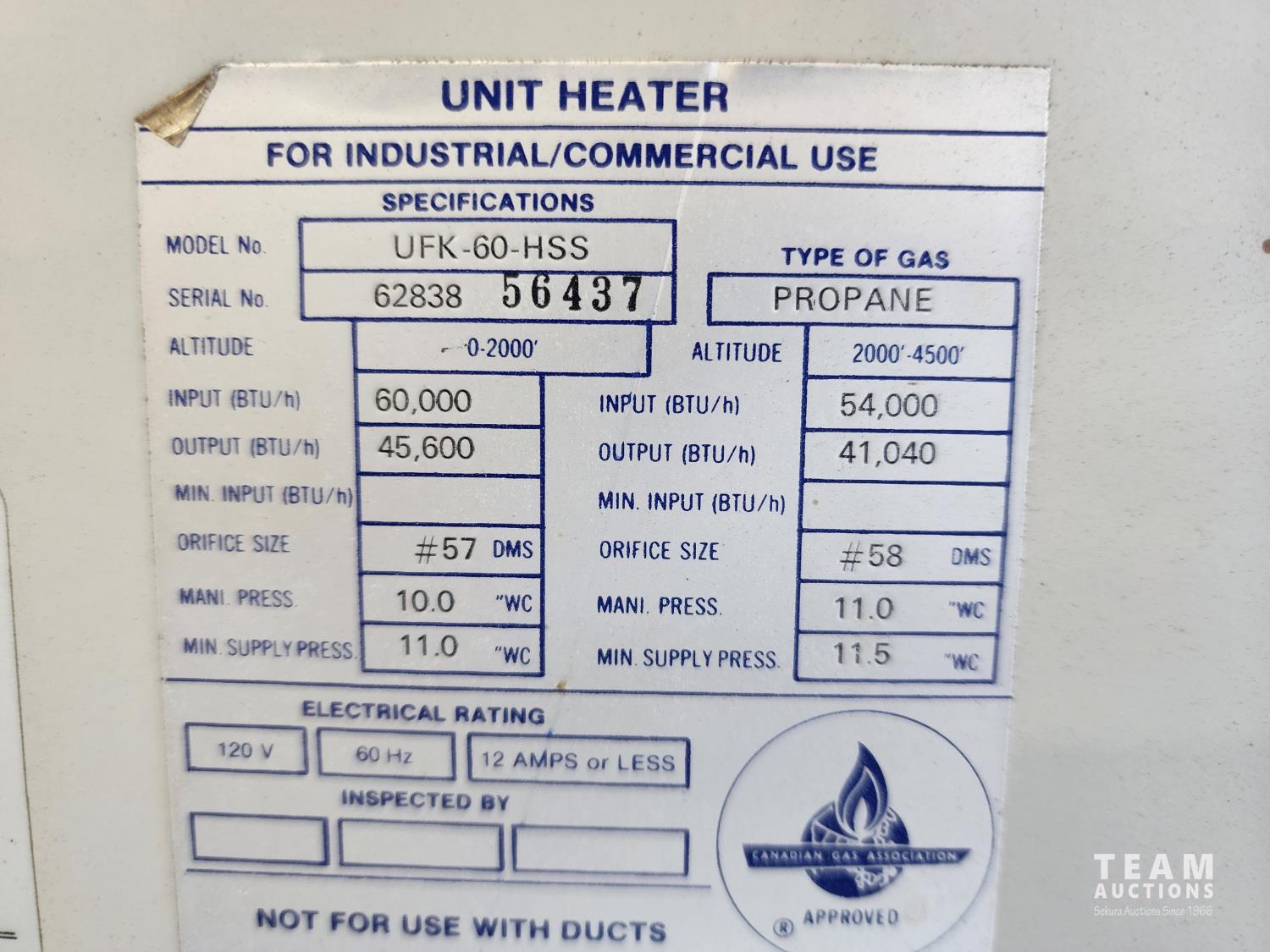 54,000 BTU input, 41,040 BTU output, 120v, 60 hz