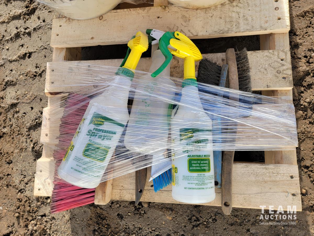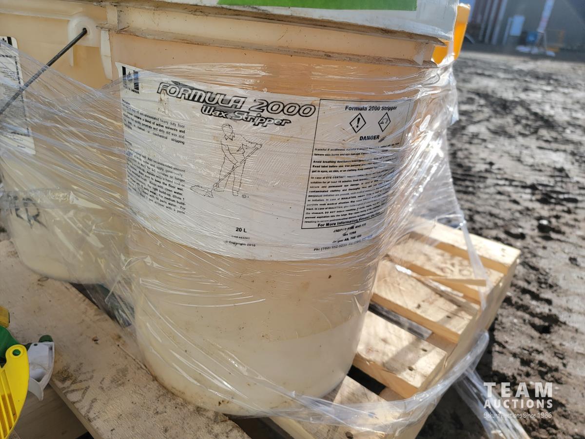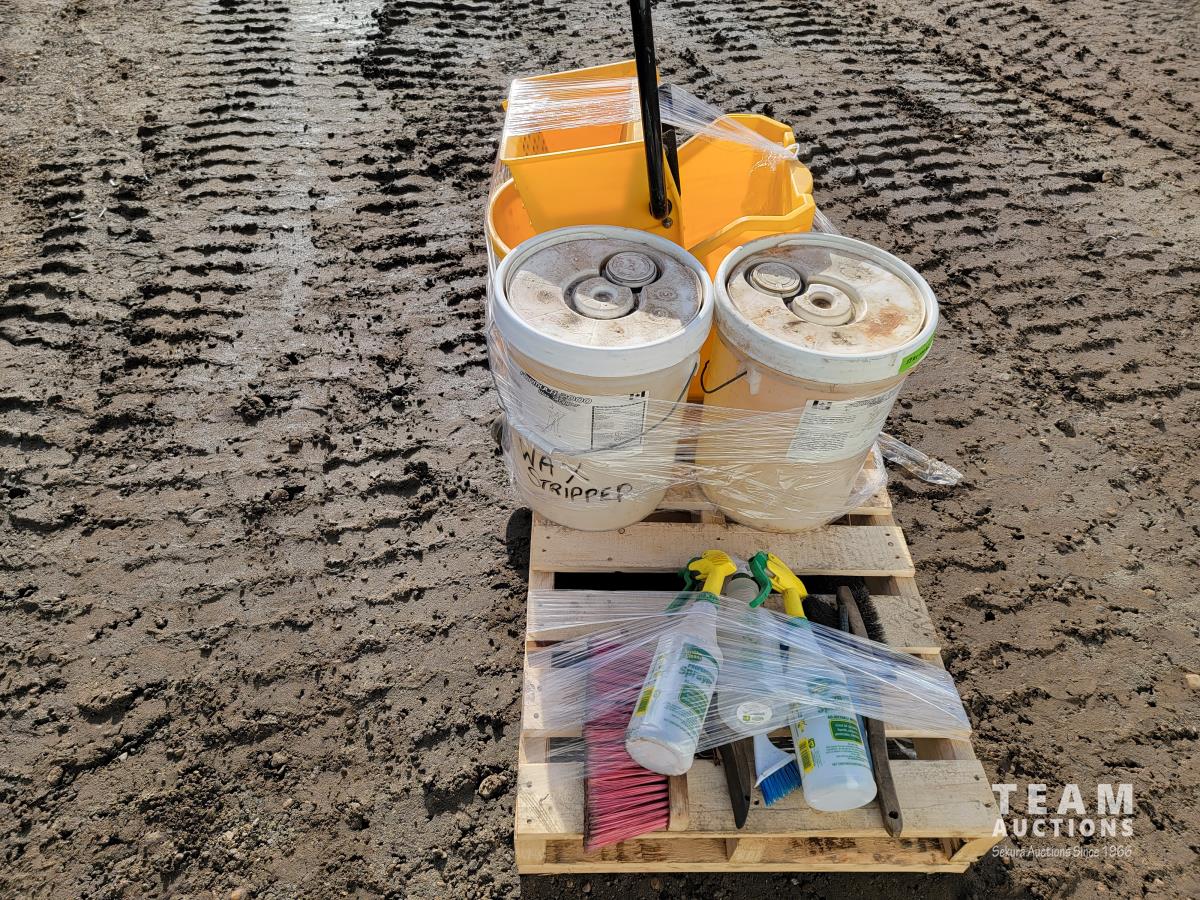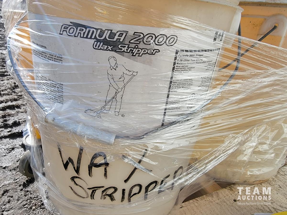 1159 Mop Pail, (2) Pails Formula 2000 Wax Stripper, Spray Bottles and Wire Brushes