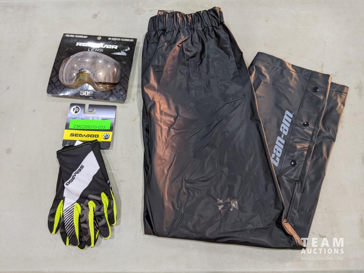 1264 Can-Am Mud Pants Size Men's Medium, Sea-Doo Gloves Size 3XL and Revolver Lens (Unused)