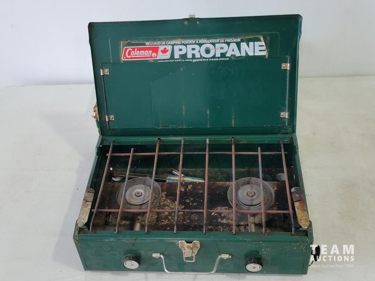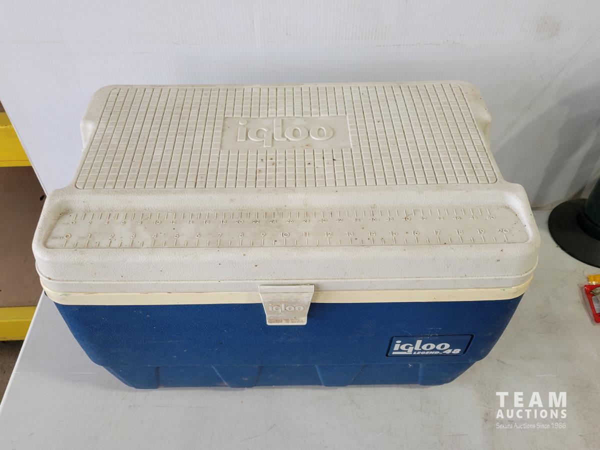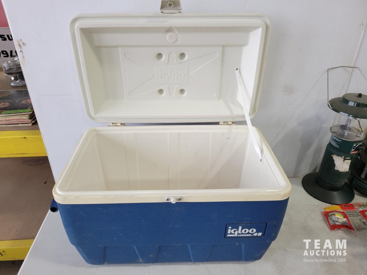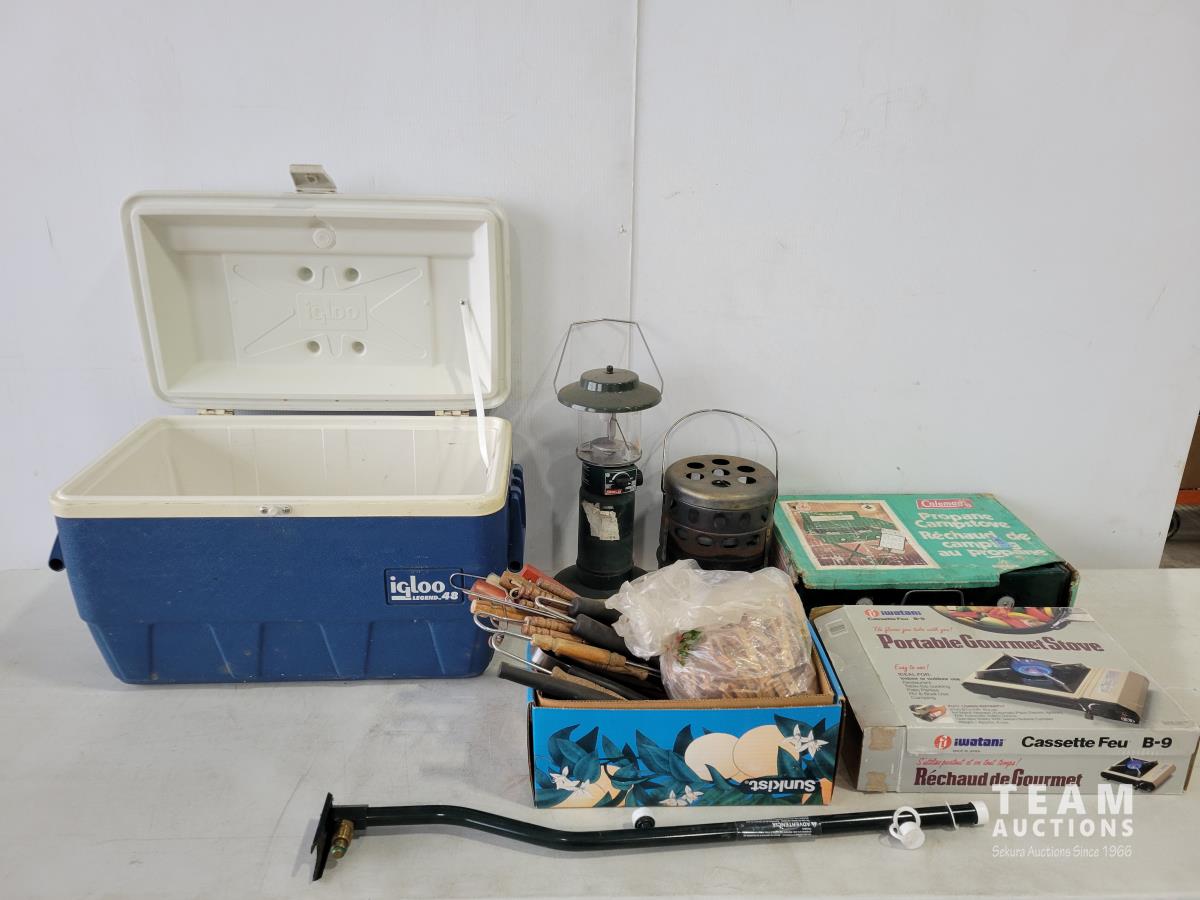 Igloo cooler, propane tree, Coleman camp stove, portable gourmet stove, propane lantern, propane heater, qty of BBQ tools, clothes pins