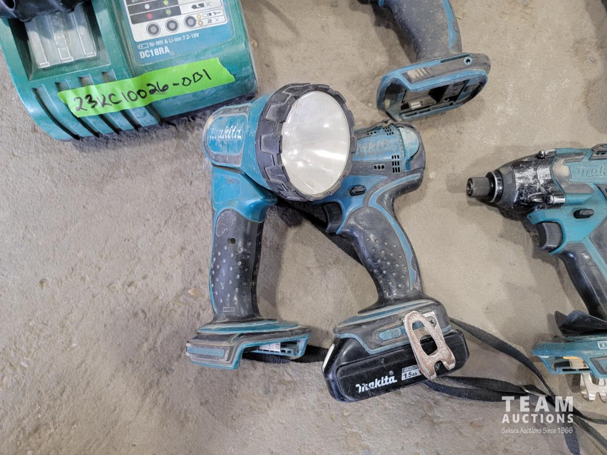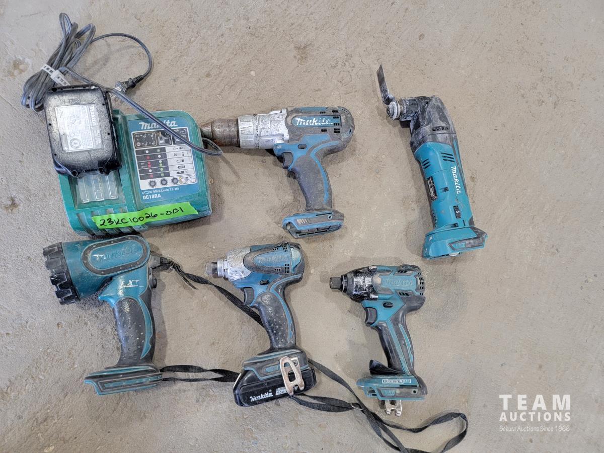 Makita 18v battery and charger, concrete drill, flash light, multitool and drills