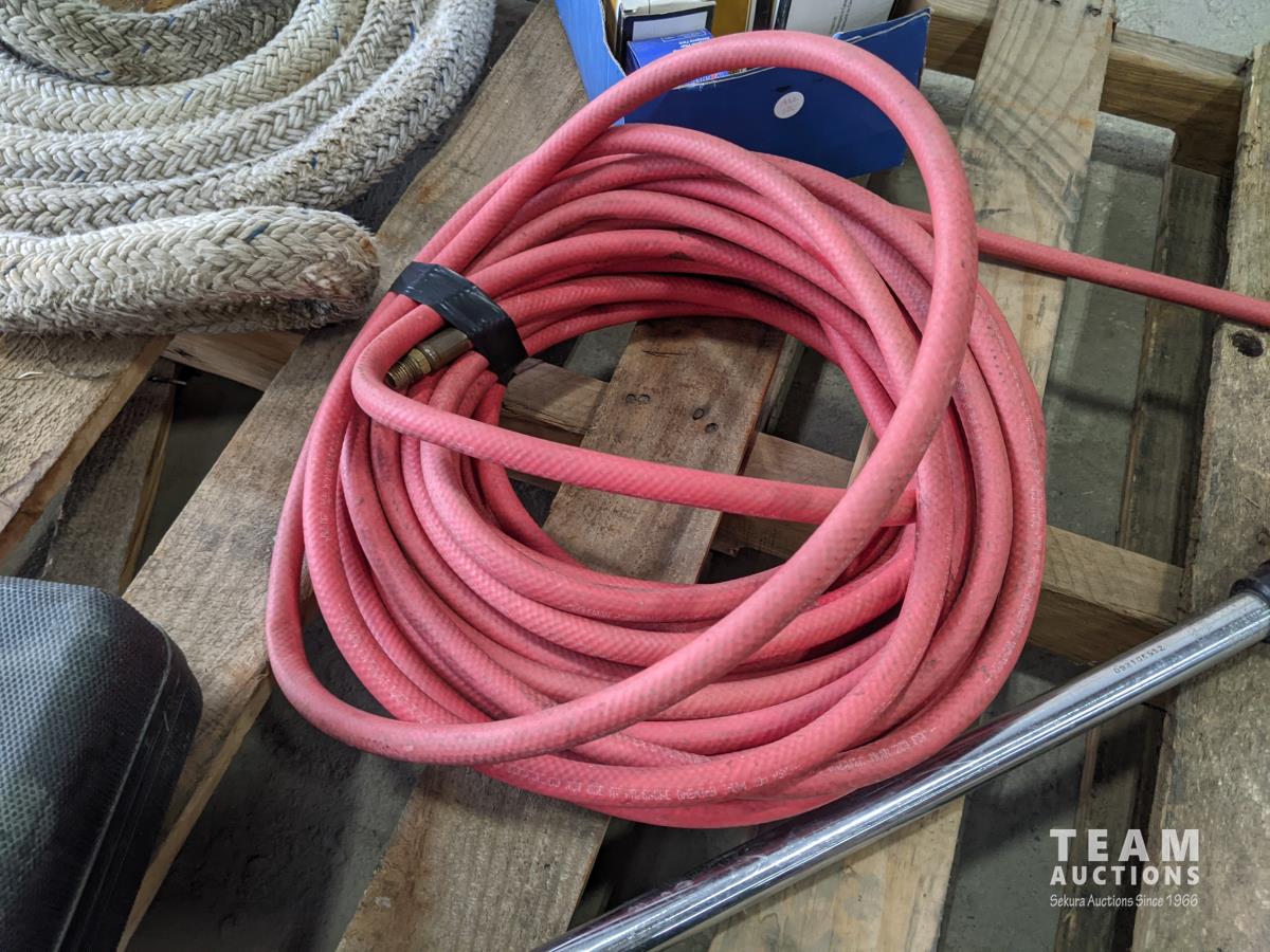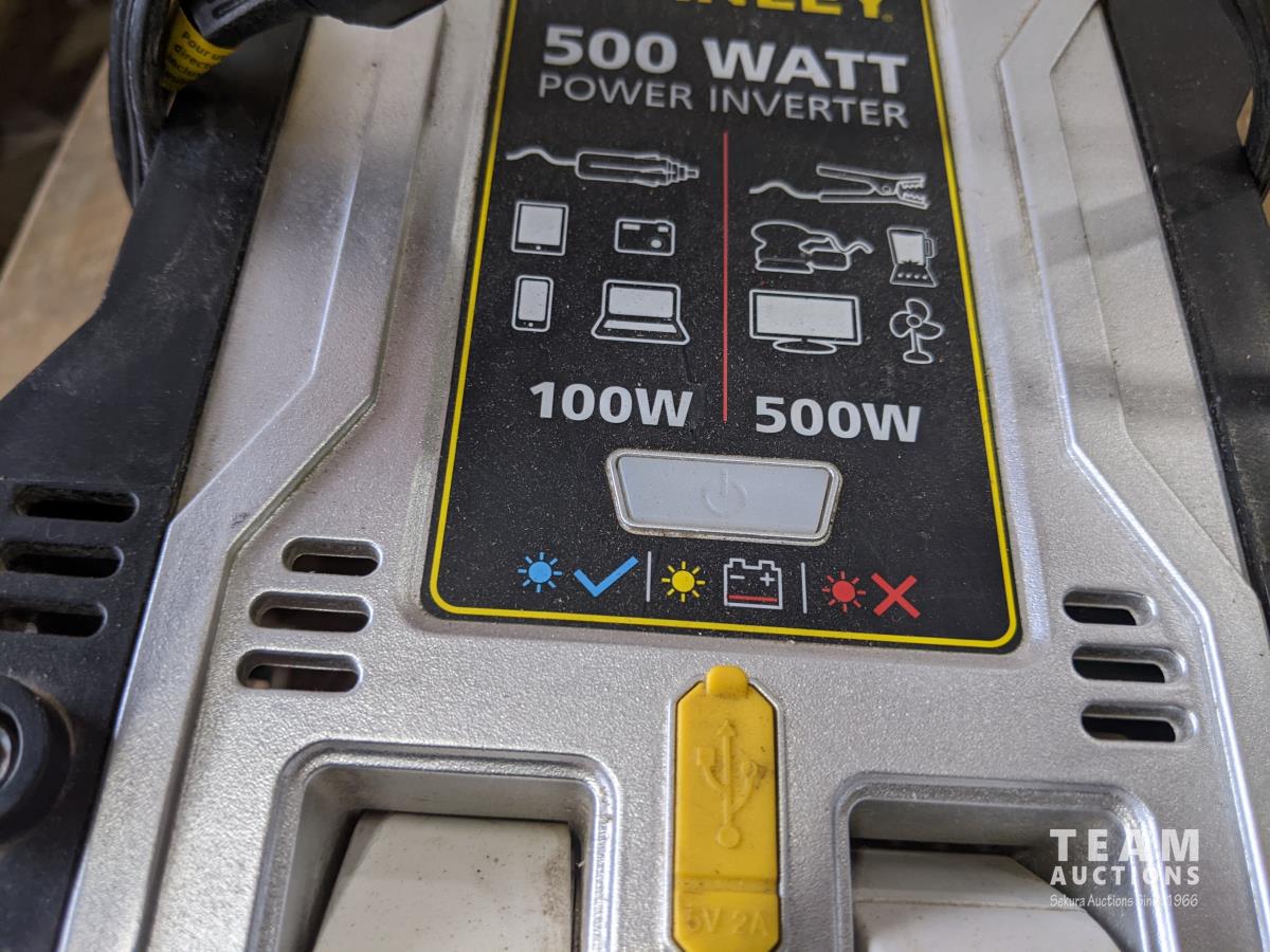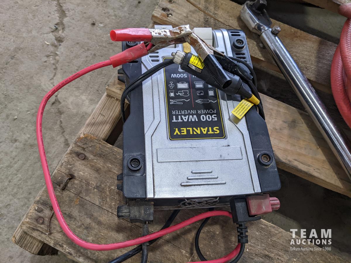 Braided tow rope, marker lights airline, Craftsman torque wrench, Stanley 500w power inverter, level and roll of caution tape