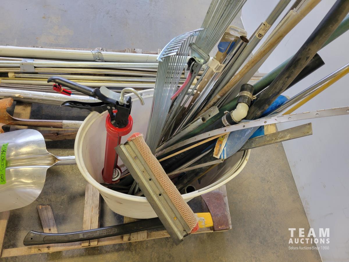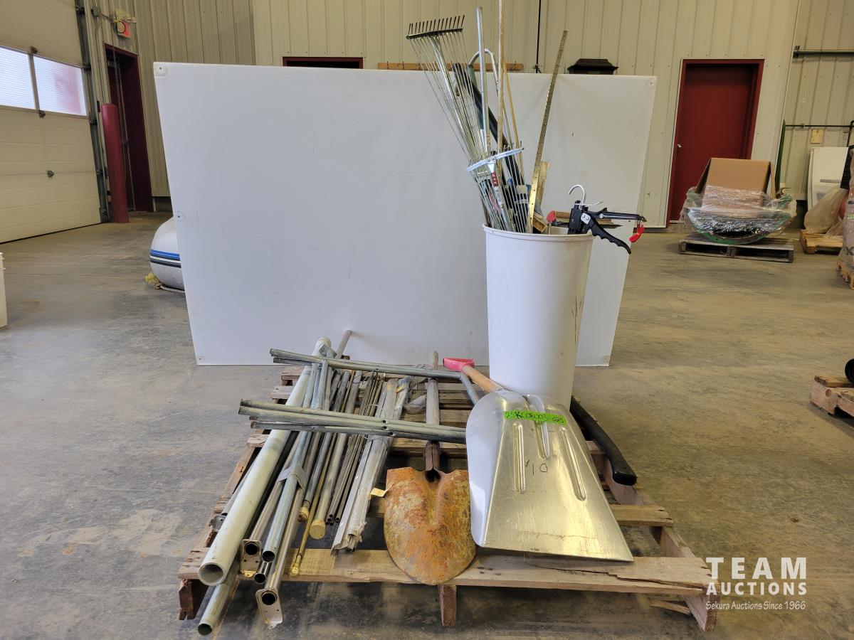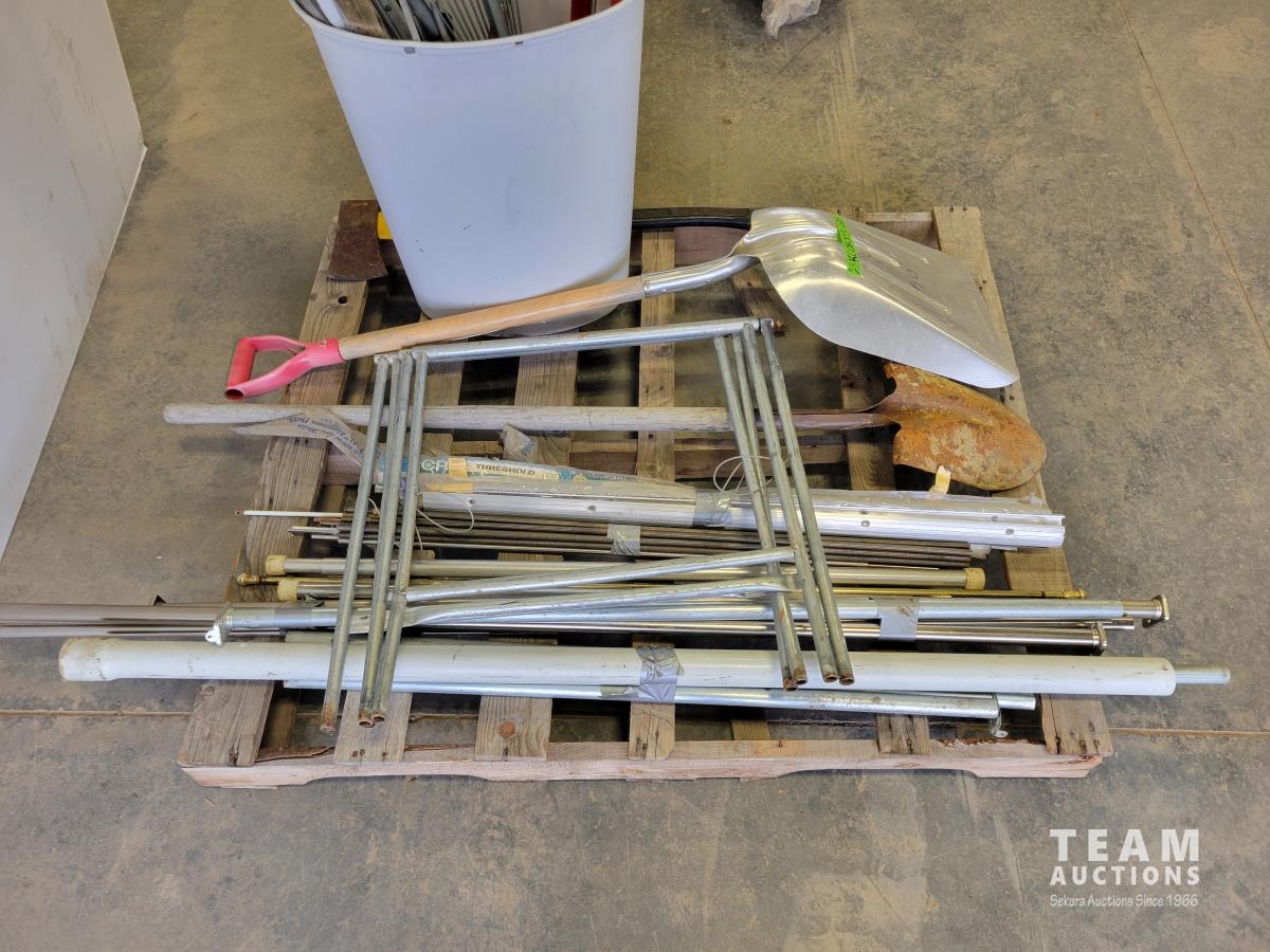 Shovels, axe, squeegee, 13 inch caulking gun, adjustable rakes, continuous hinge, aluminum threshold