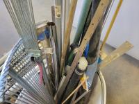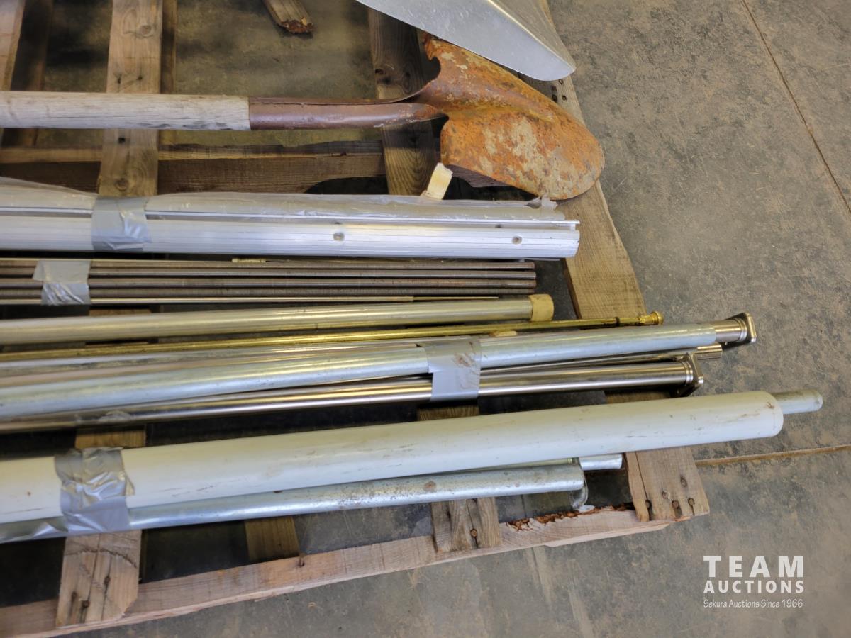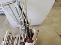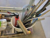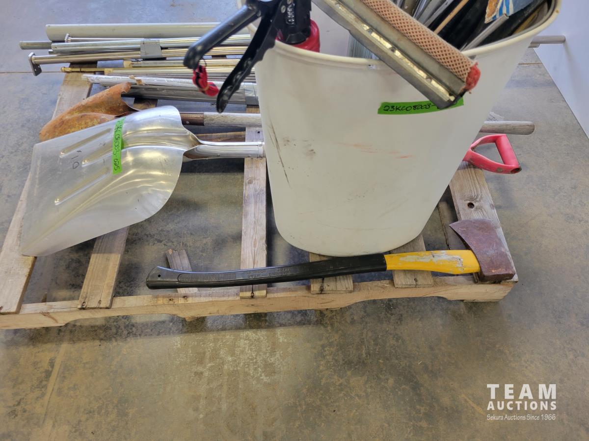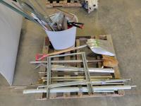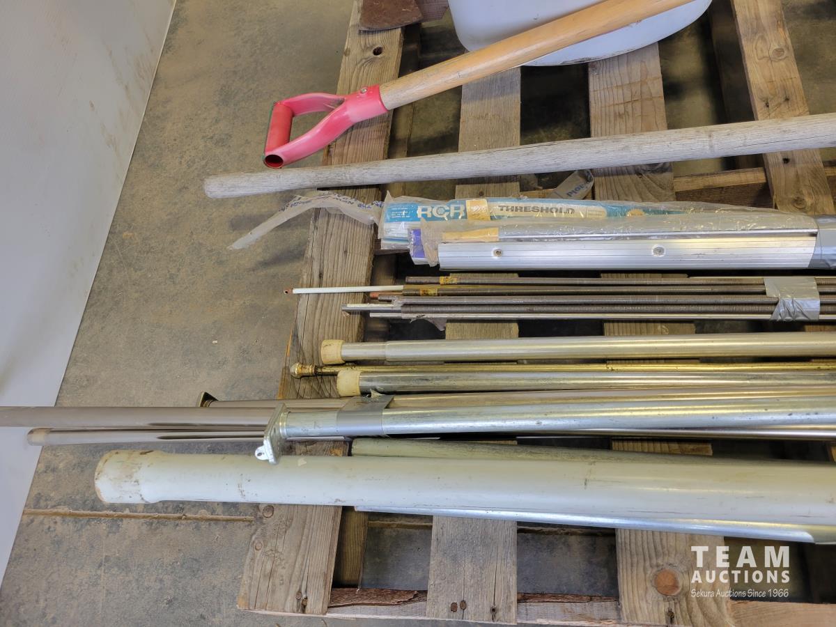 Shovels, axe, squeegee, 13 inch caulking gun, adjustable rakes, continuous hinge, aluminum threshold