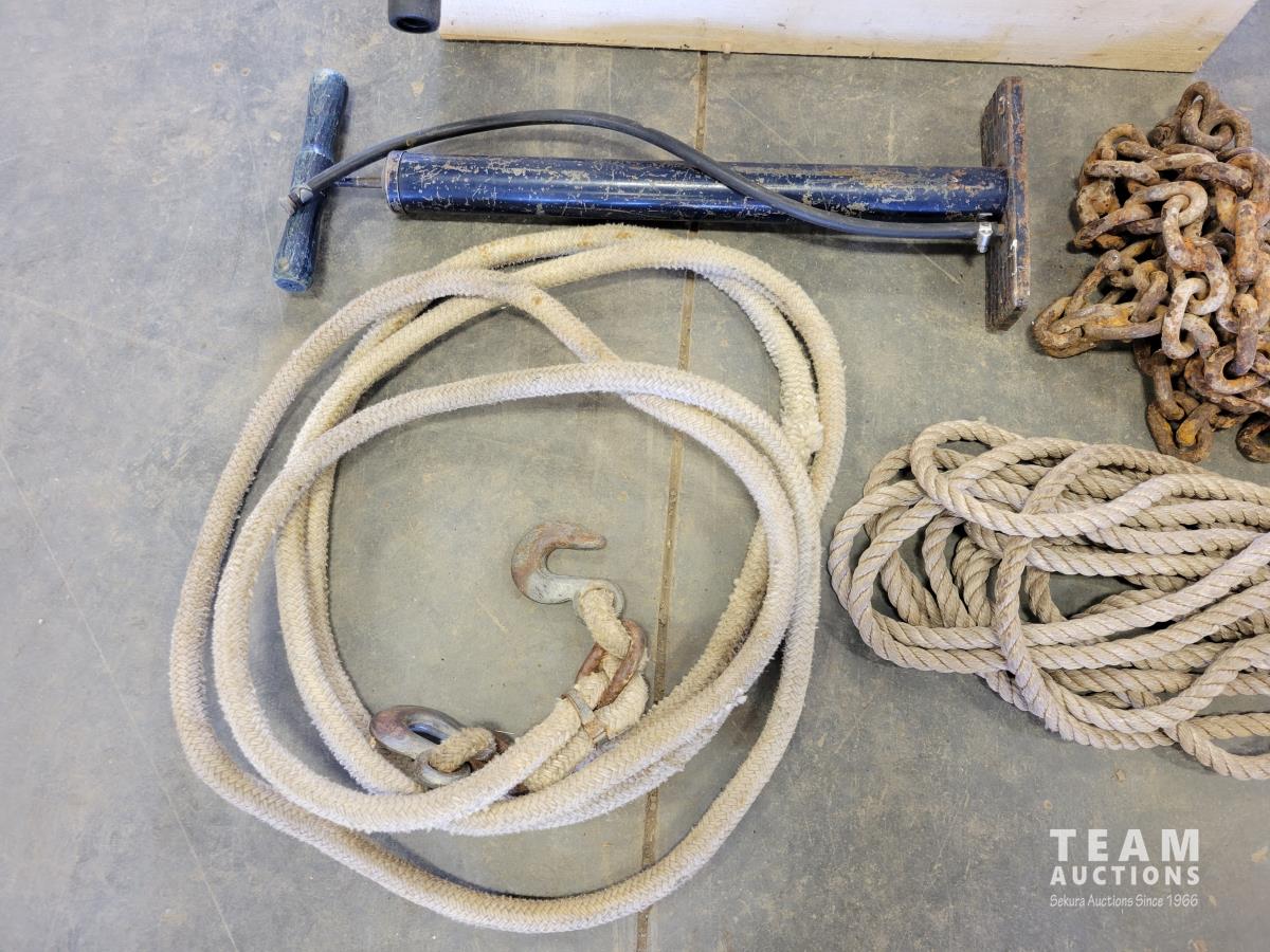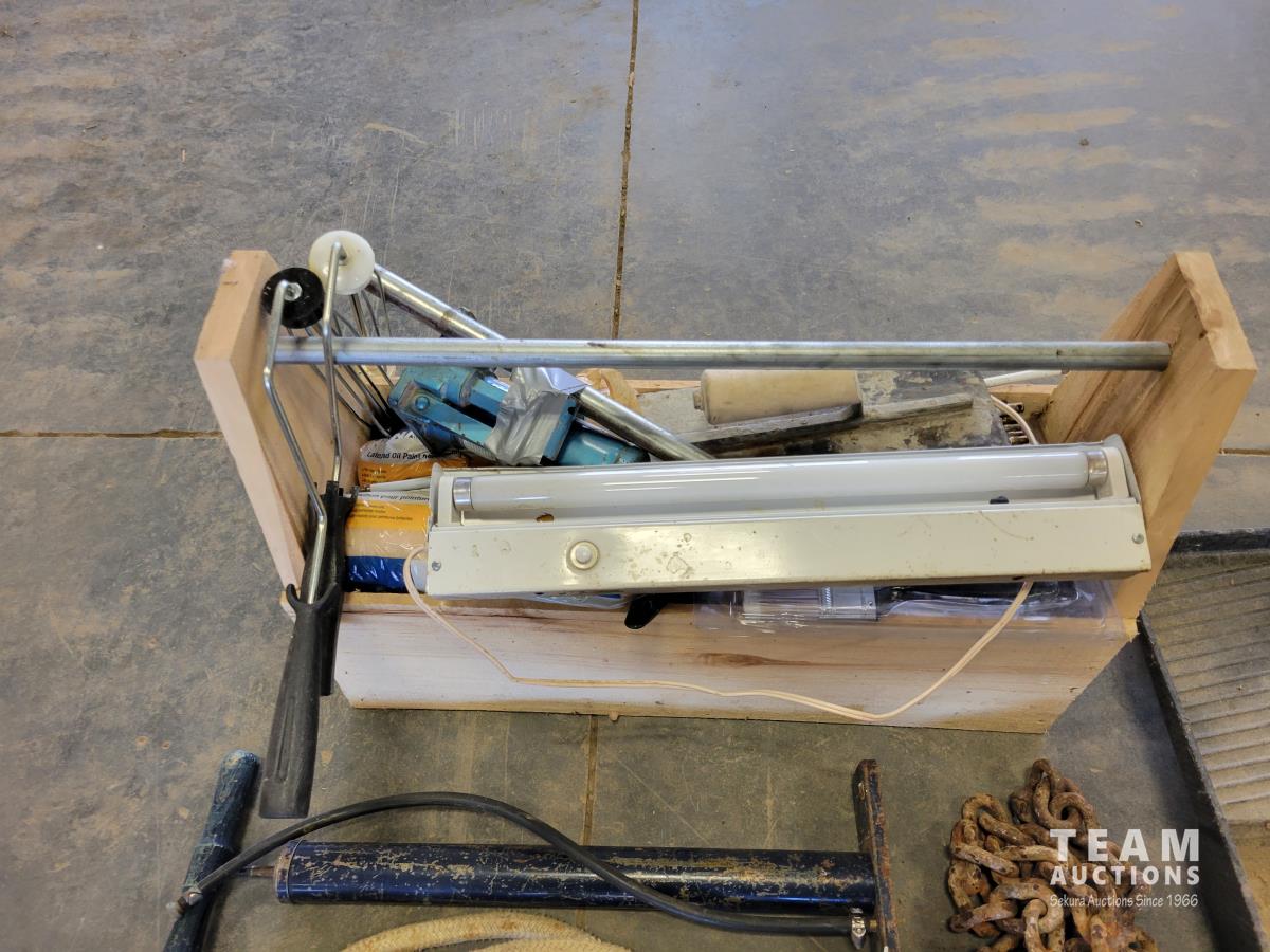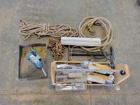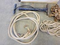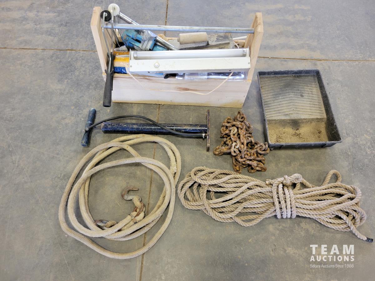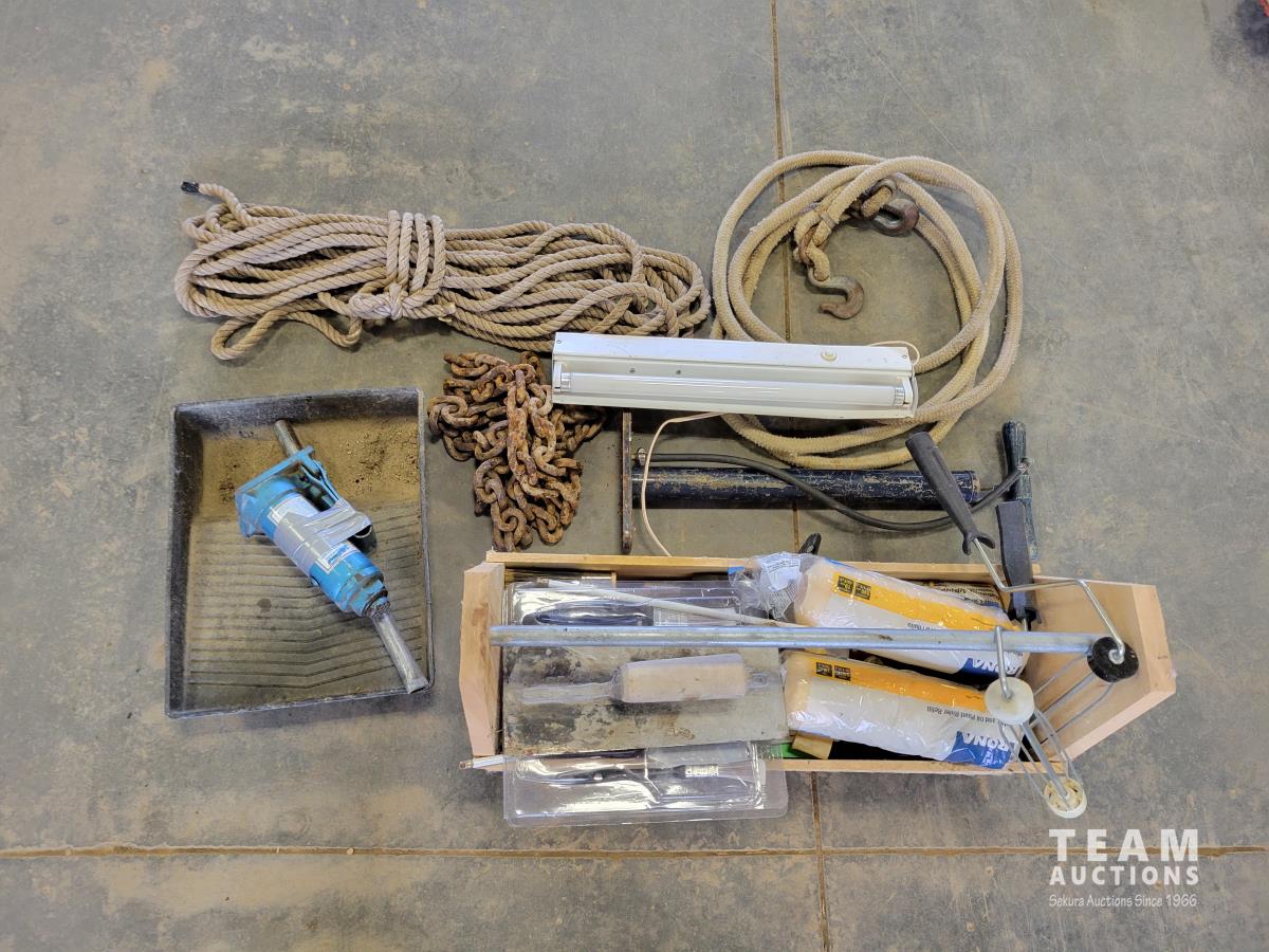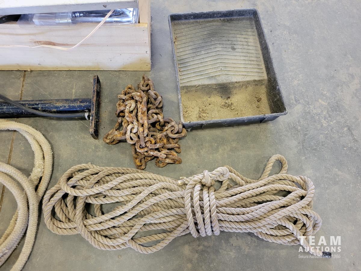 Paint rollers, paint roller tray, small bottle jack, length of rope, chain