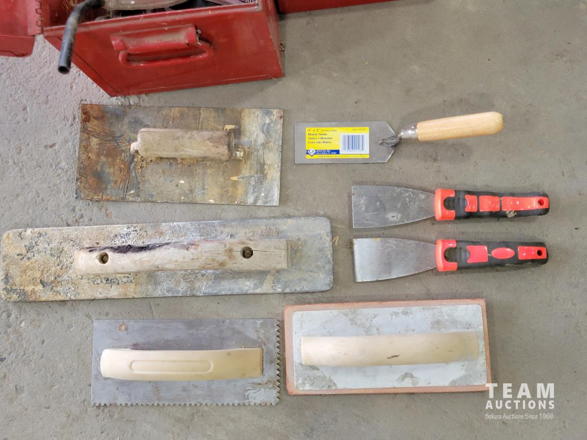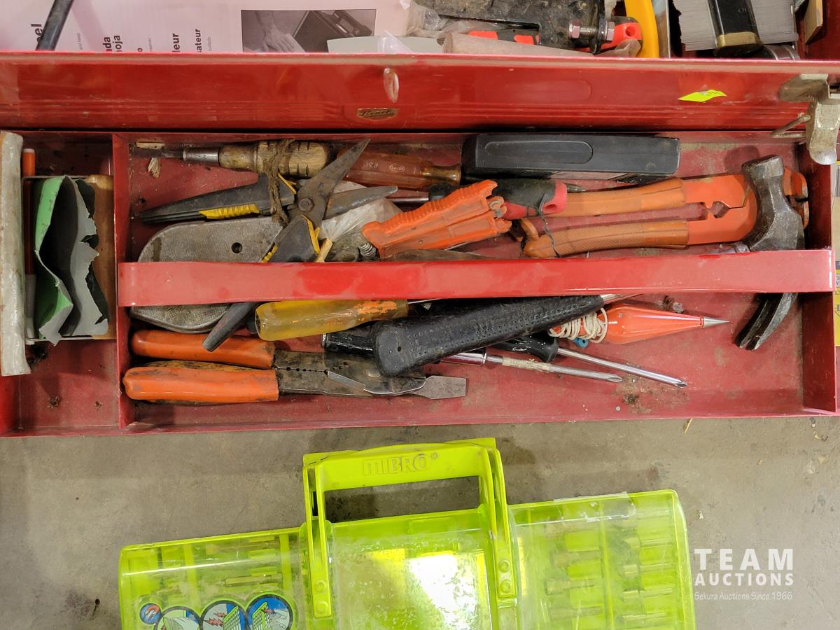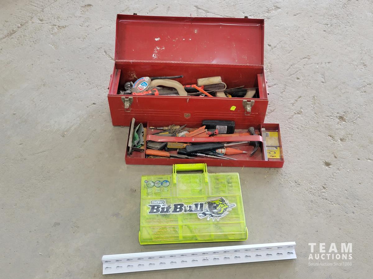 Mibro Bit Bull set, trowels, antifreeze tester, hammer, screwdrivers, toolbox, shelving corners