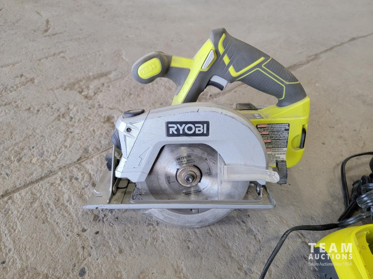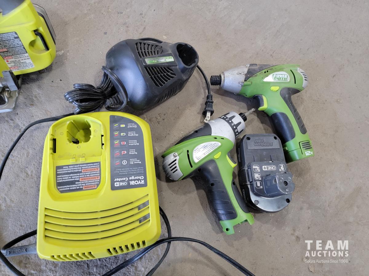 1271 Ryobi Saw, Charger, 18v Batteries and 12v Power Smith Drills