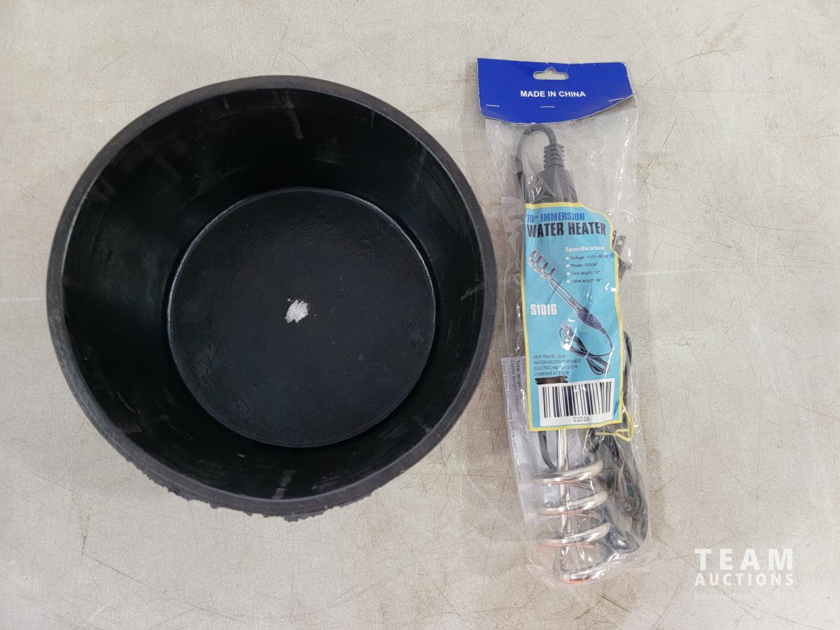 1496 Small Rubber Feed/Water Bowl and 10 Inch Immersion Water Heater (Unused)