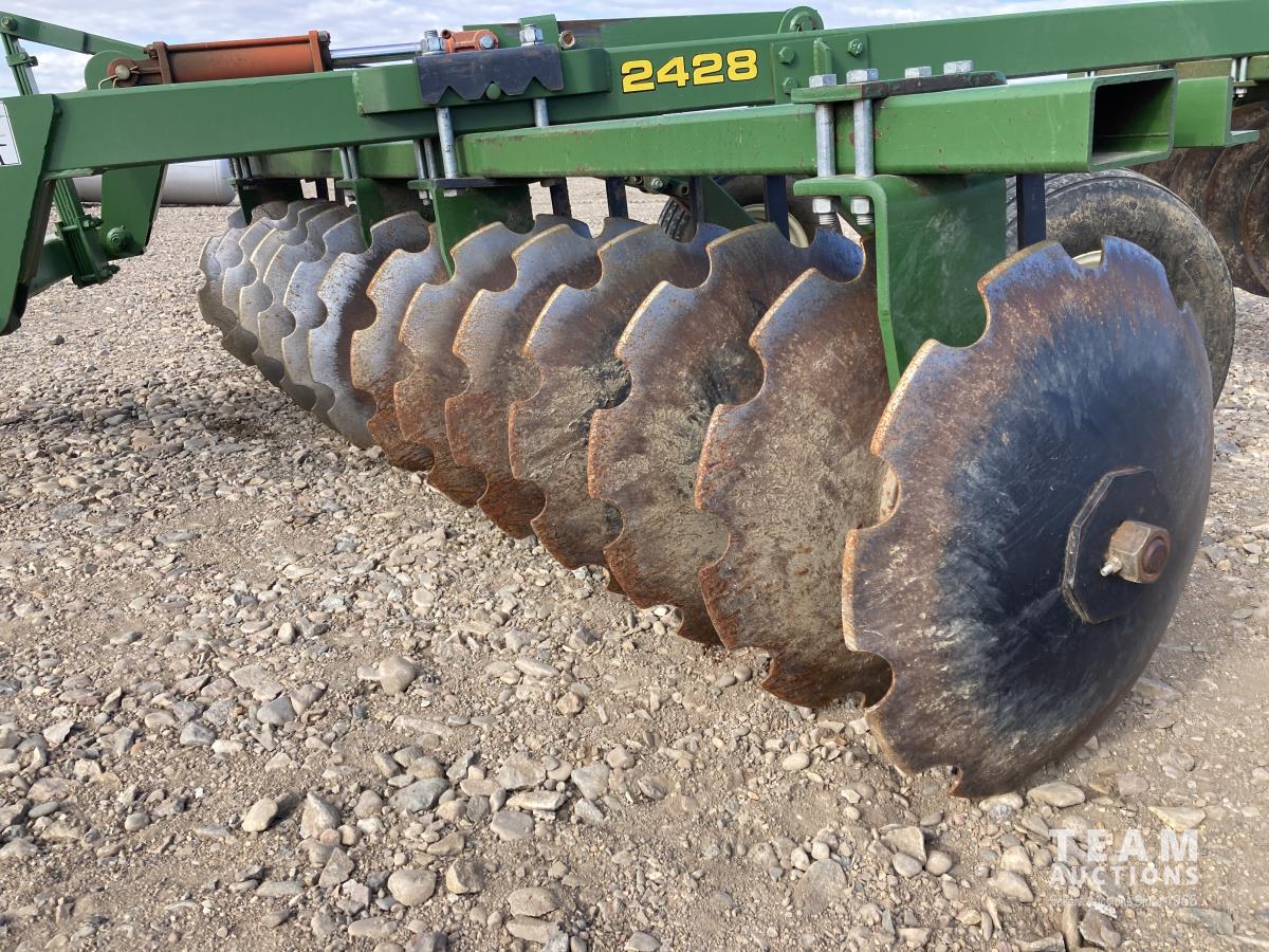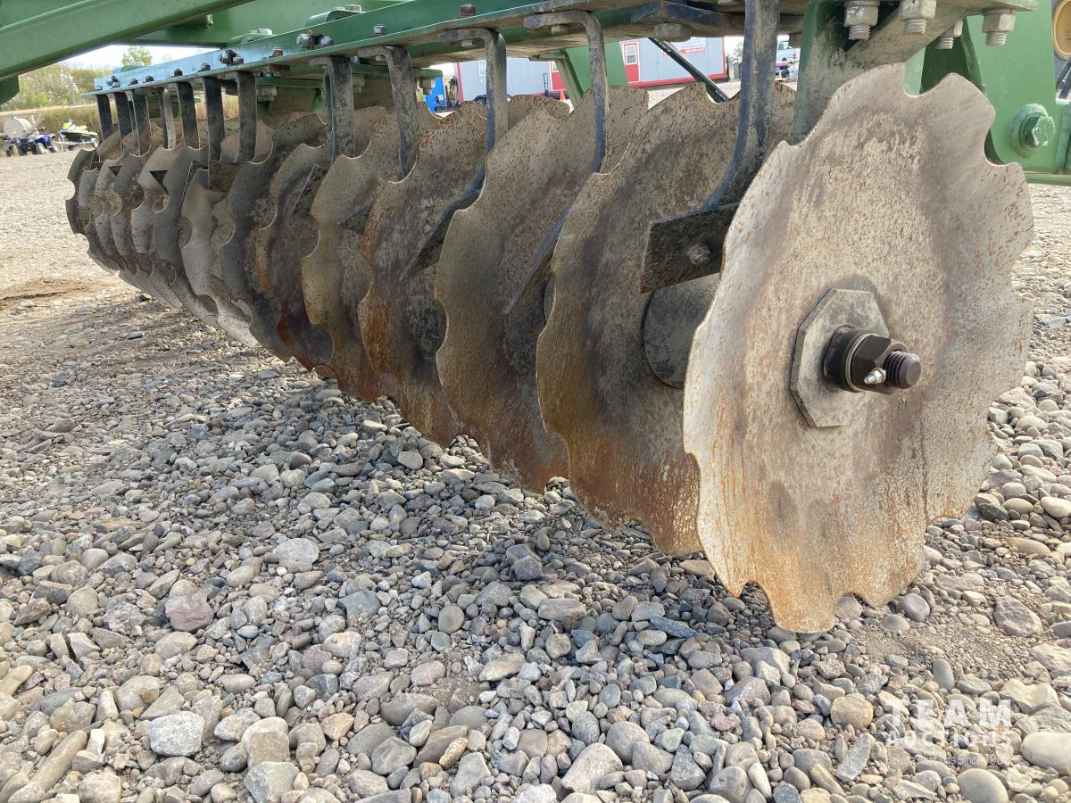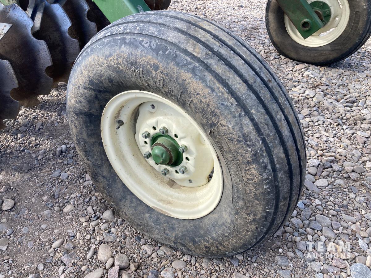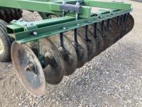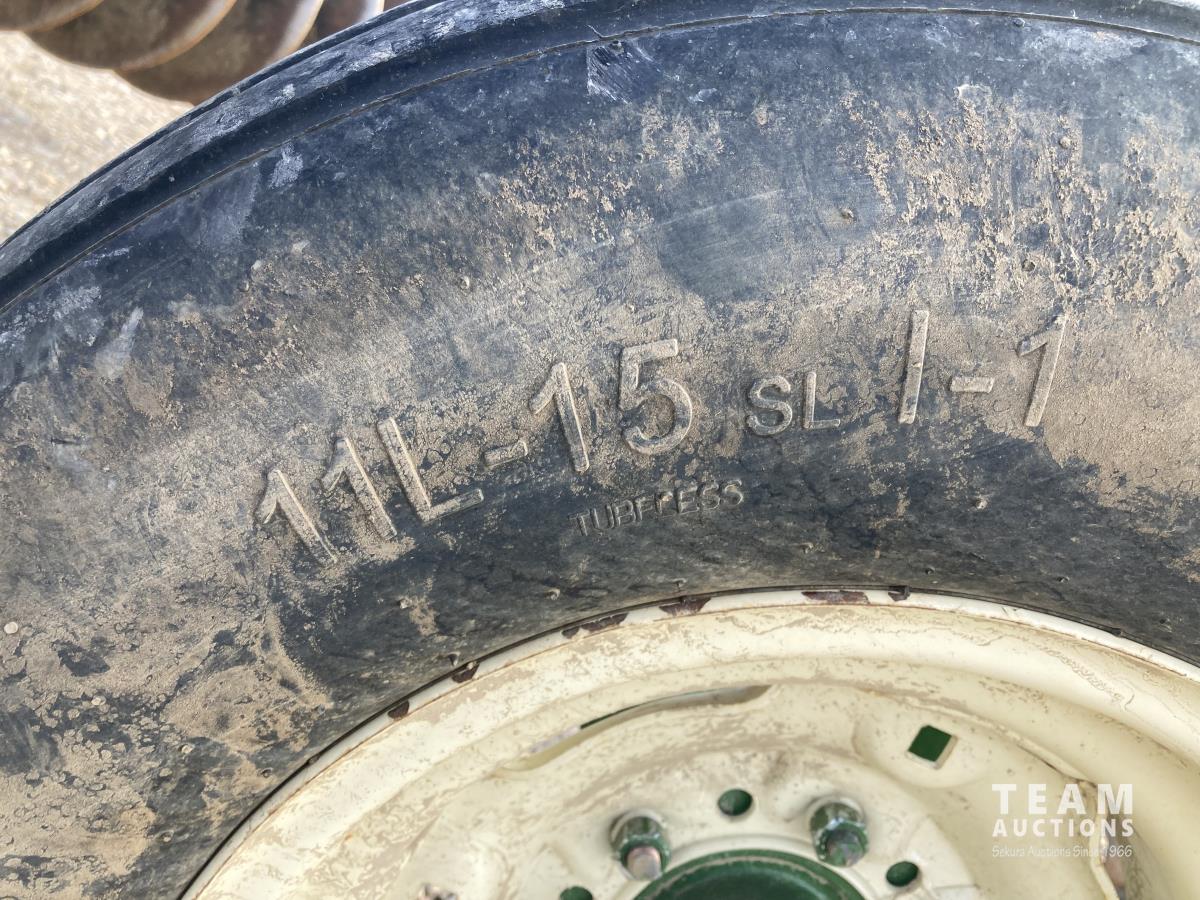 24 inch serated front discs, 24 inch deep cone rear discs, 9 inch spacing, mud scrapers, 11L-15 tire size