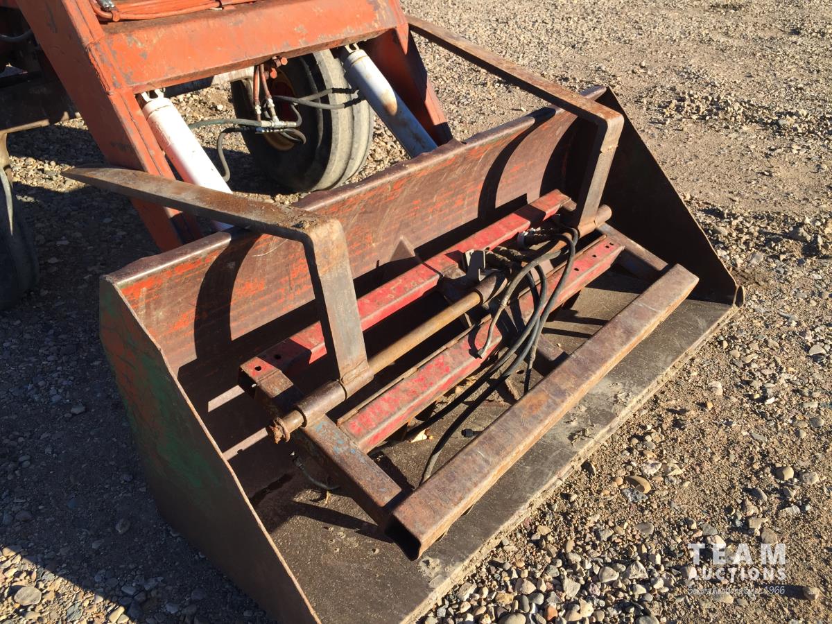 Loader, 78 inch bucket, 40 inch pallet forks, Perkins A6.354 5.8 L 6 cylinder diesel engine, 94 PTO HP, 6 speed manual transmission, cab, Includes fork attachments, 540/1000 PTO, 2 rear hydraulic outlets, 14L-16.1 front tires, 18.4-34 rear tires