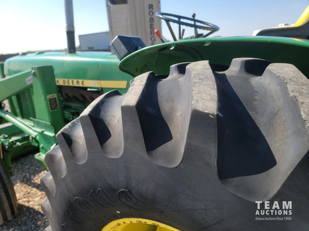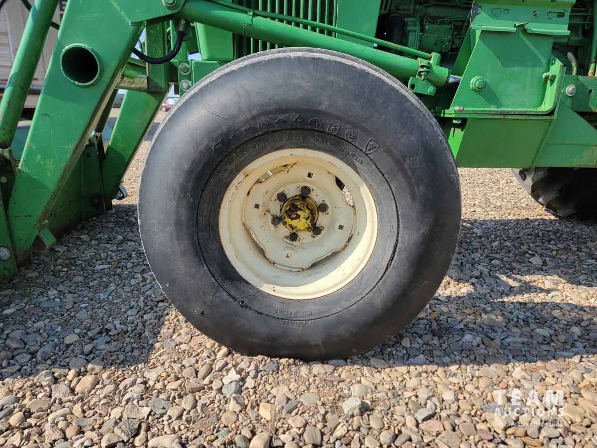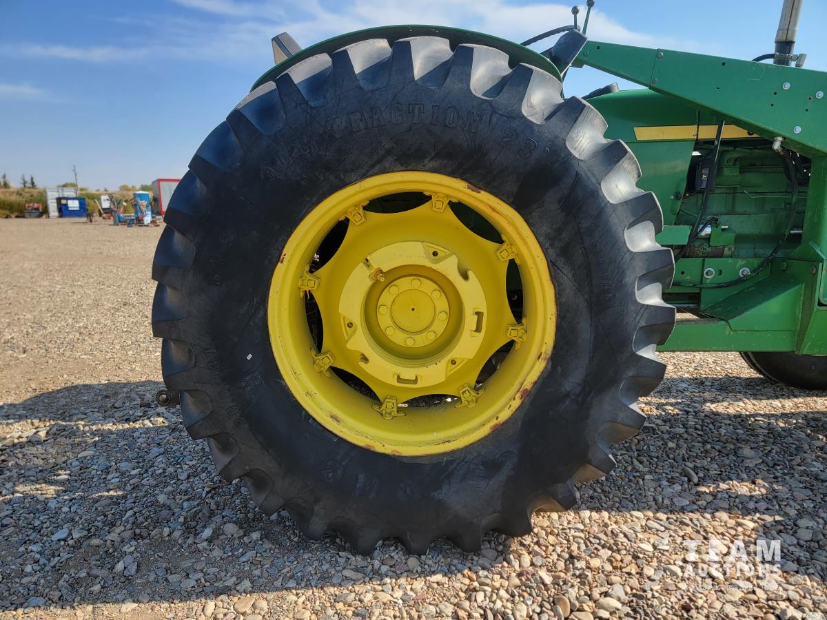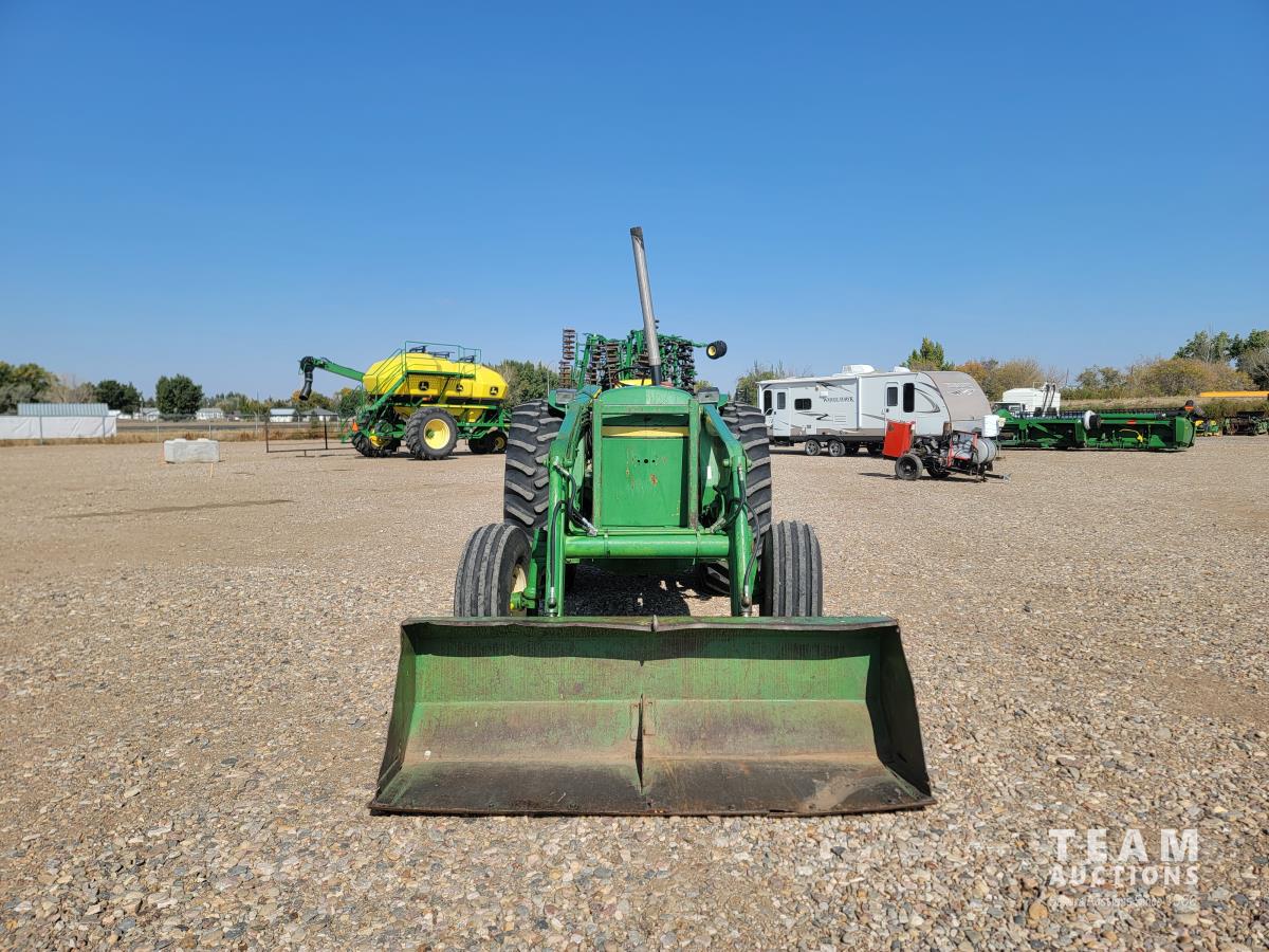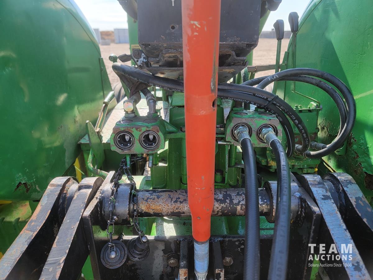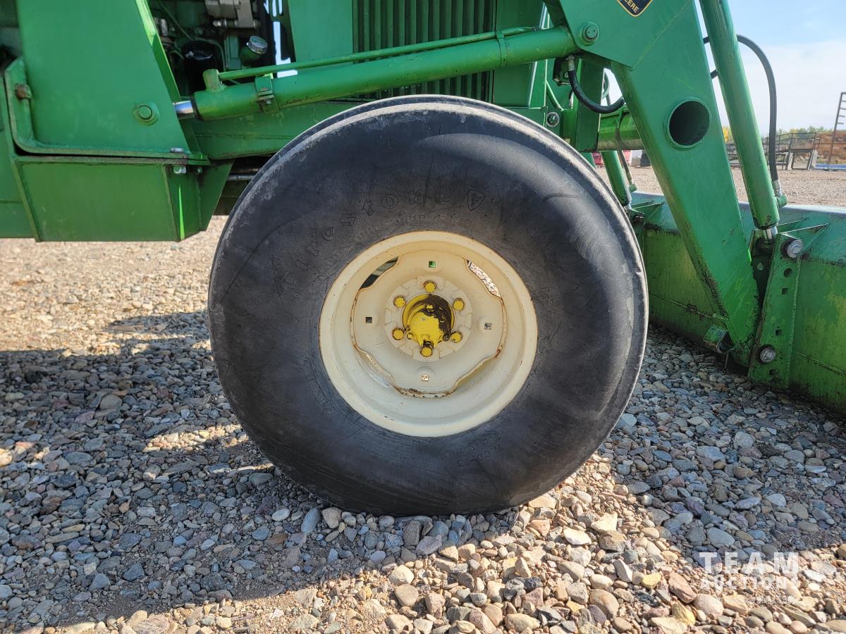 John Deere loader, 84 inch bucket, 5.4 L 6 cylinder 97 HP, diesel engine, 75 PTO HP, 12 speed manual transmission, 23 GPM hydraulic pump, open station platform, 540/1000 PTO, 3 point hitch, 2 rear hydraulic outlets, 11.00-16 front tires, 20.8-34 rear tires