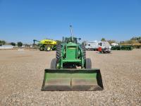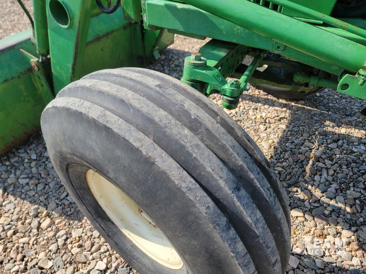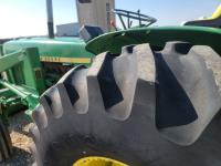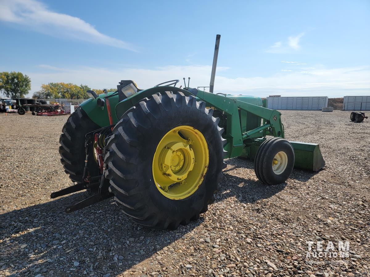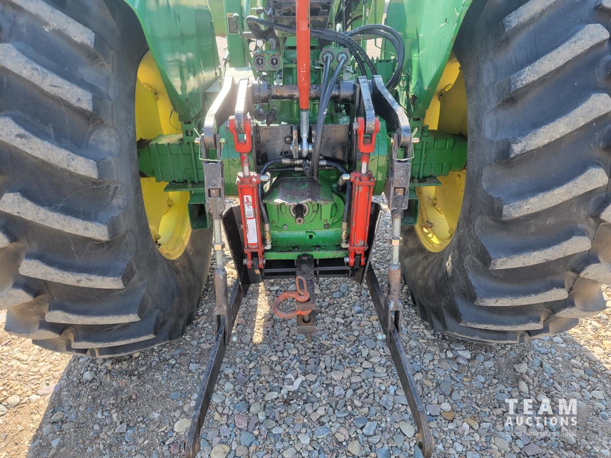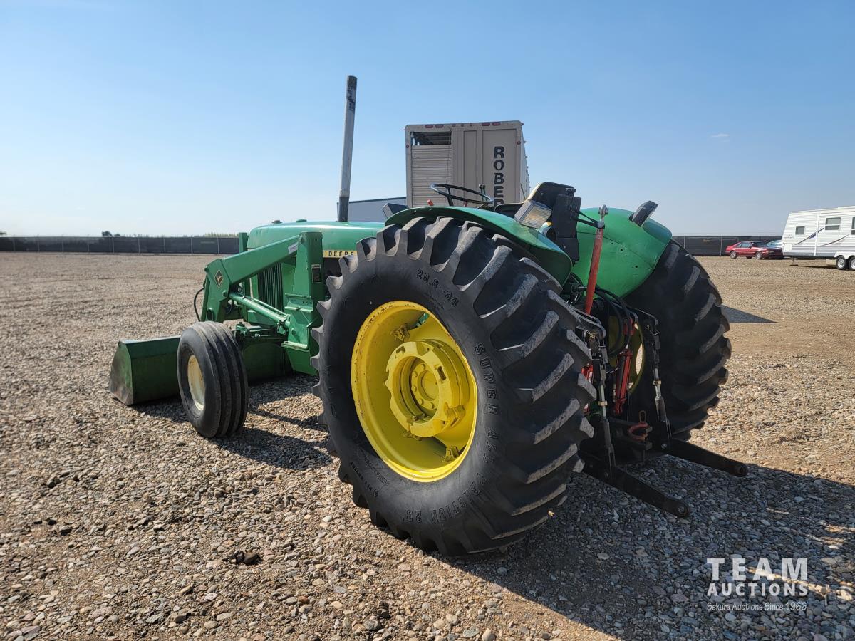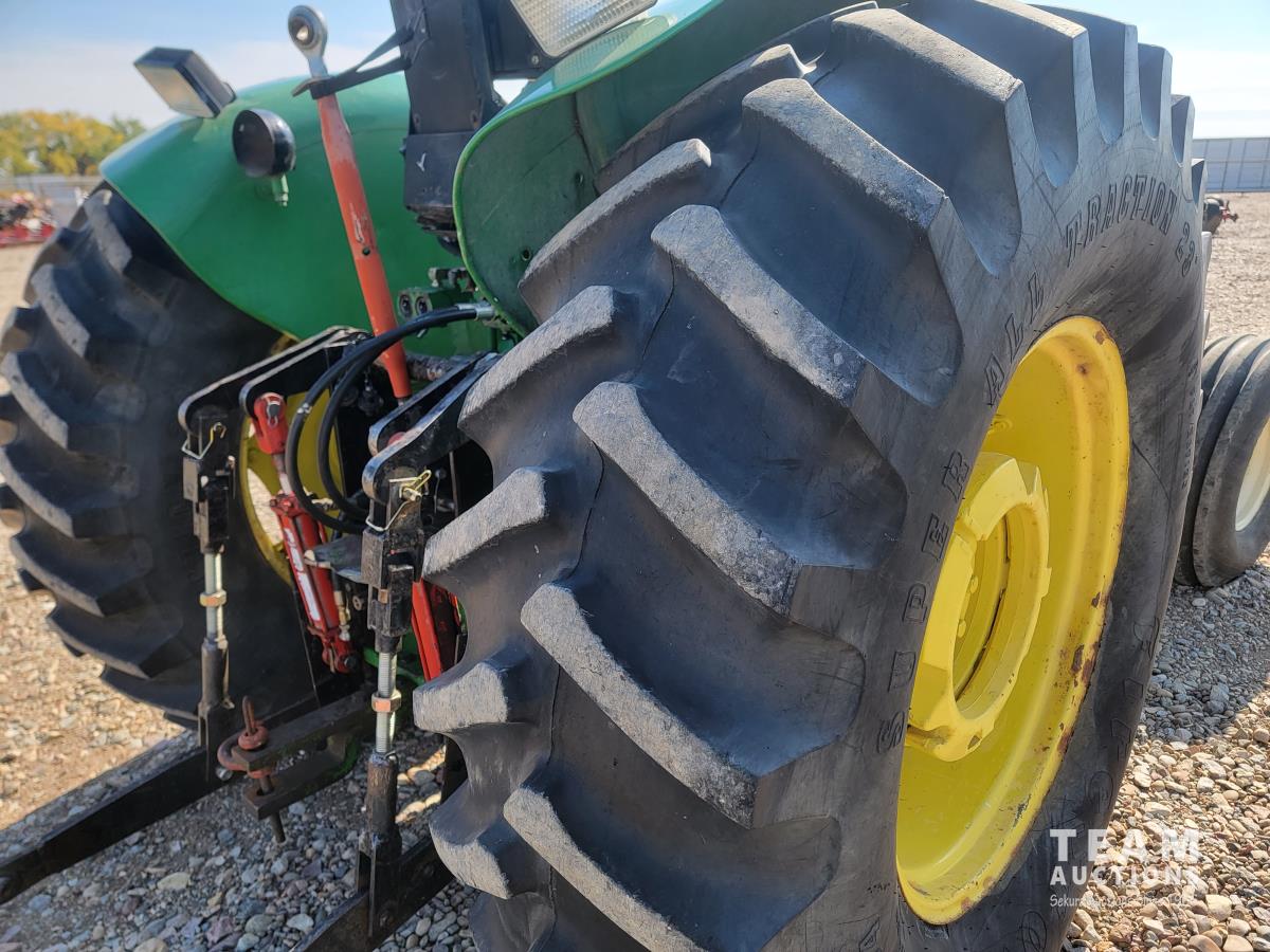 John Deere loader, 84 inch bucket, 5.4 L 6 cylinder 97 HP, diesel engine, 75 PTO HP, 12 speed manual transmission, 23 GPM hydraulic pump, open station platform, 540/1000 PTO, 3 point hitch, 2 rear hydraulic outlets, 11.00-16 front tires, 20.8-34 rear tires