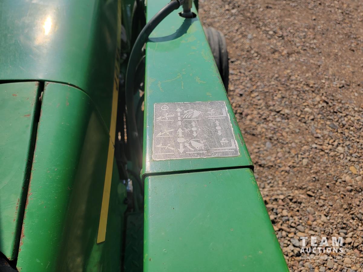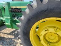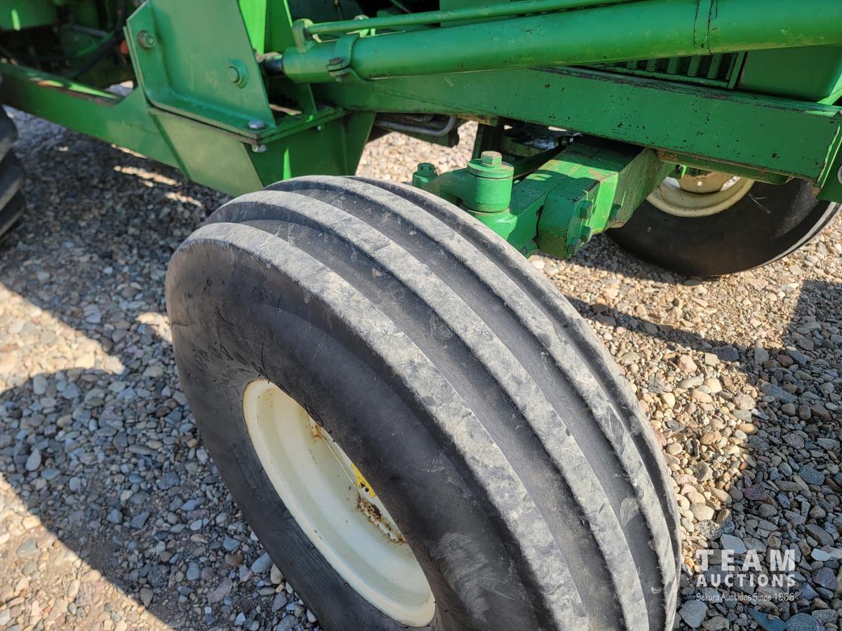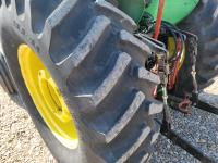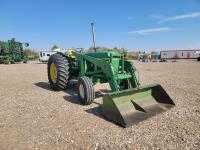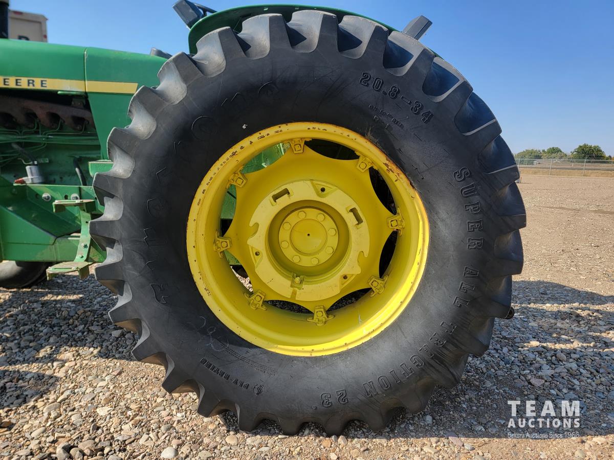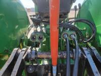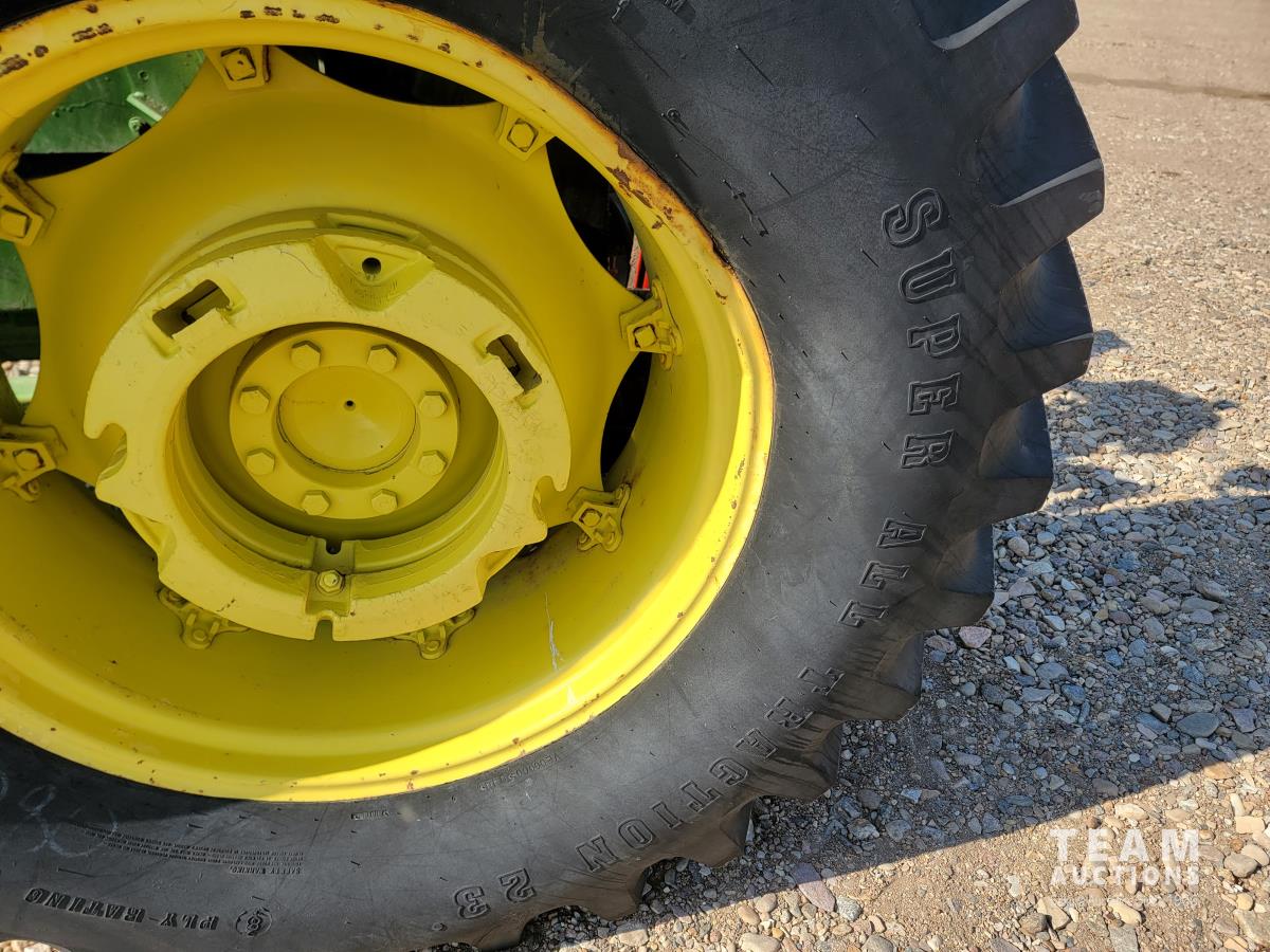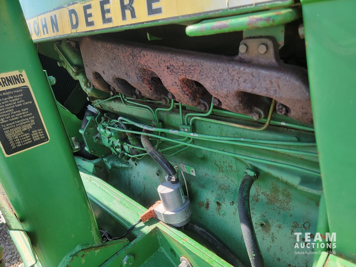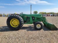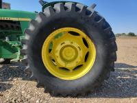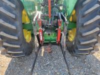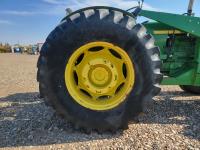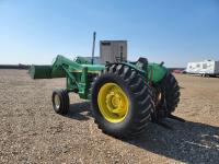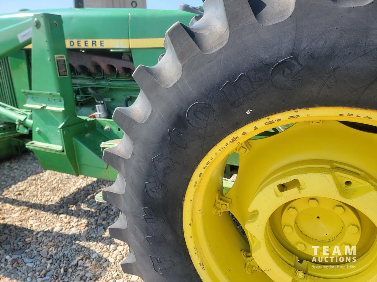 John Deere loader, 84 inch bucket, 5.4 L 6 cylinder 97 HP, diesel engine, 75 PTO HP, 12 speed manual transmission, 23 GPM hydraulic pump, open station platform, 540/1000 PTO, 3 point hitch, 2 rear hydraulic outlets, 11.00-16 front tires, 20.8-34 rear tires