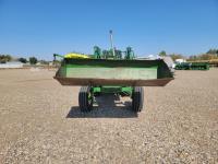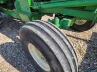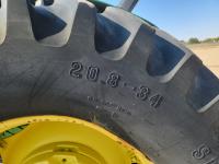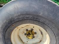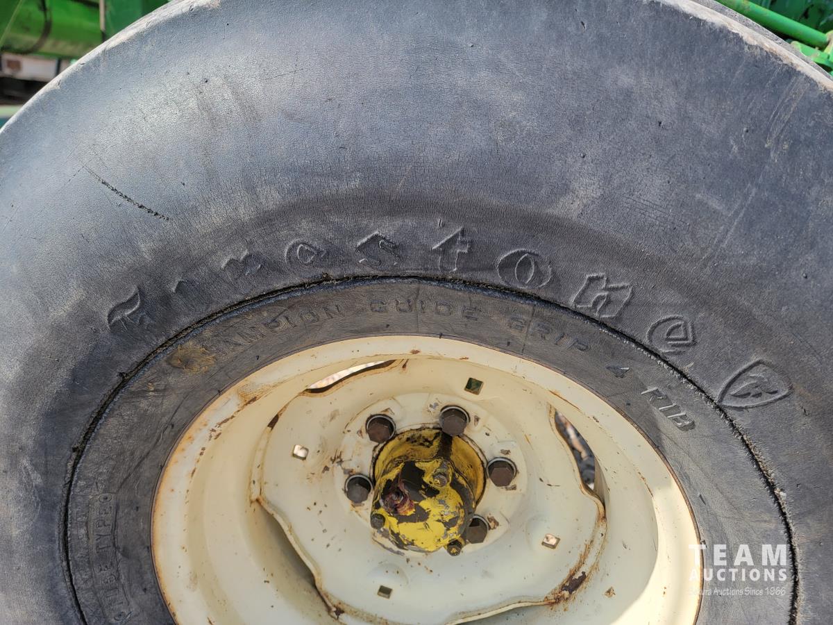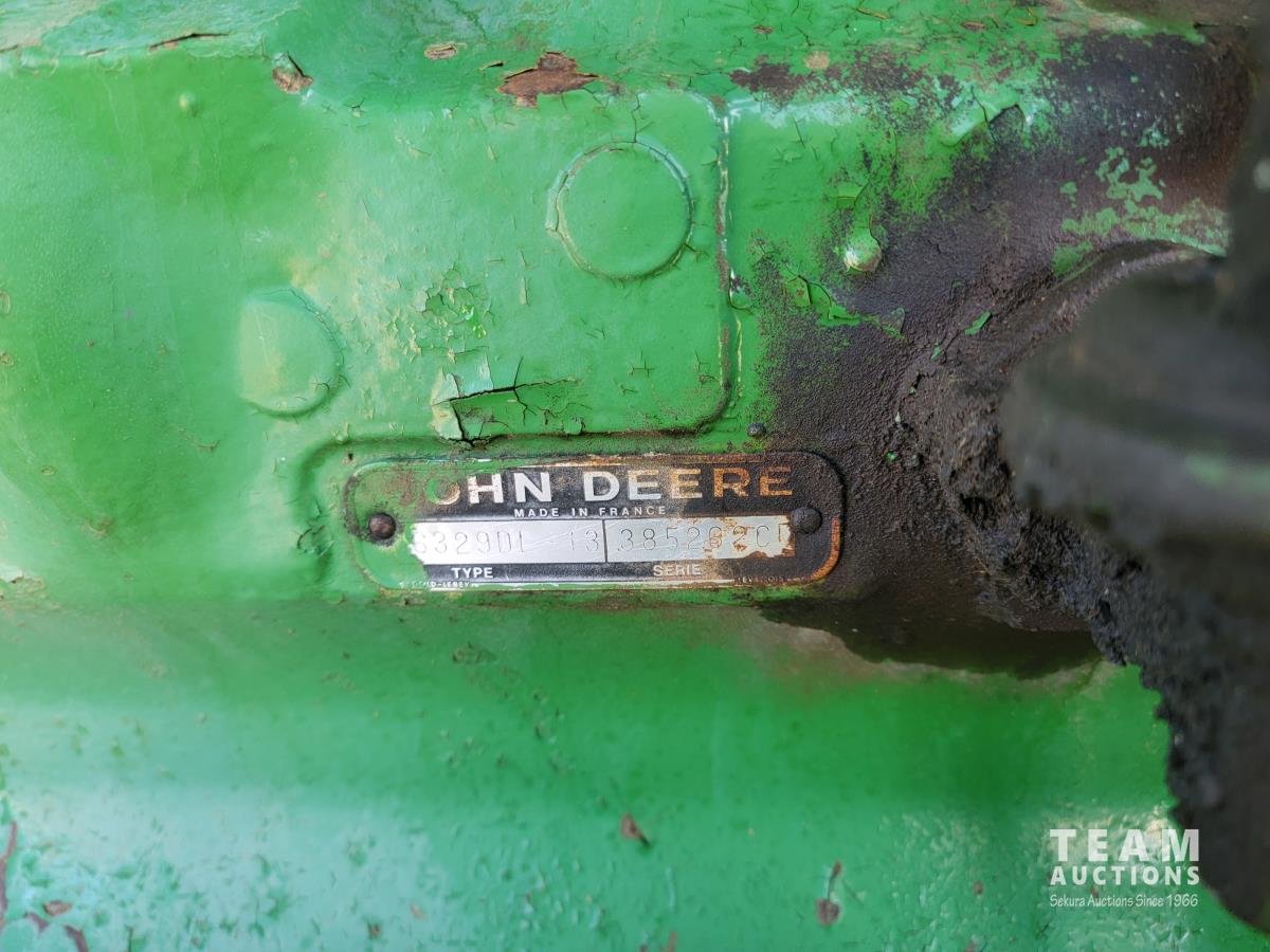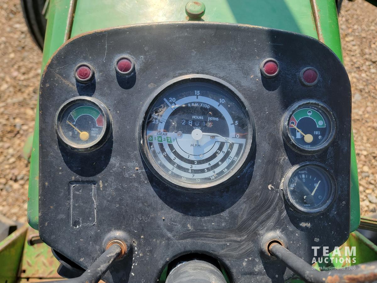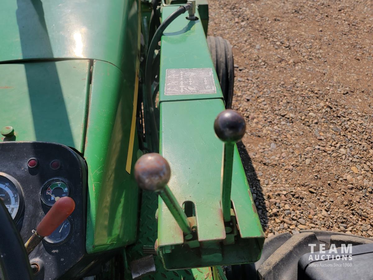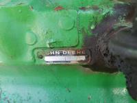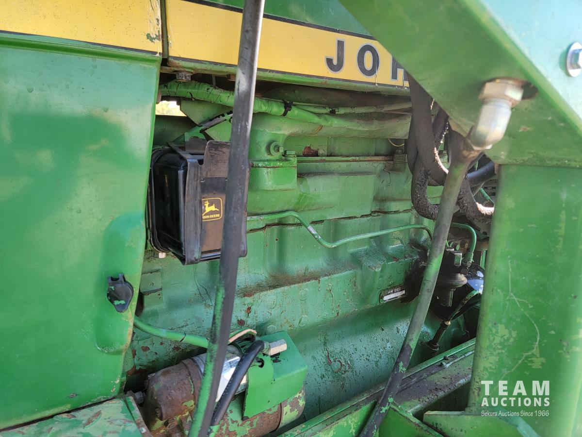 John Deere loader, 84 inch bucket, 5.4 L 6 cylinder 97 HP, diesel engine, 75 PTO HP, 12 speed manual transmission, 23 GPM hydraulic pump, open station platform, 540/1000 PTO, 3 point hitch, 2 rear hydraulic outlets, 11.00-16 front tires, 20.8-34 rear tires