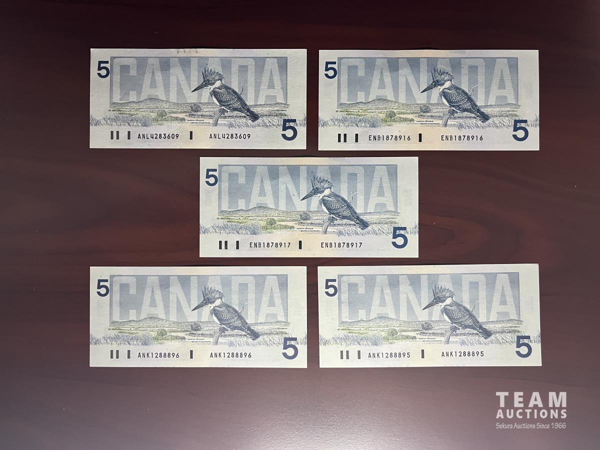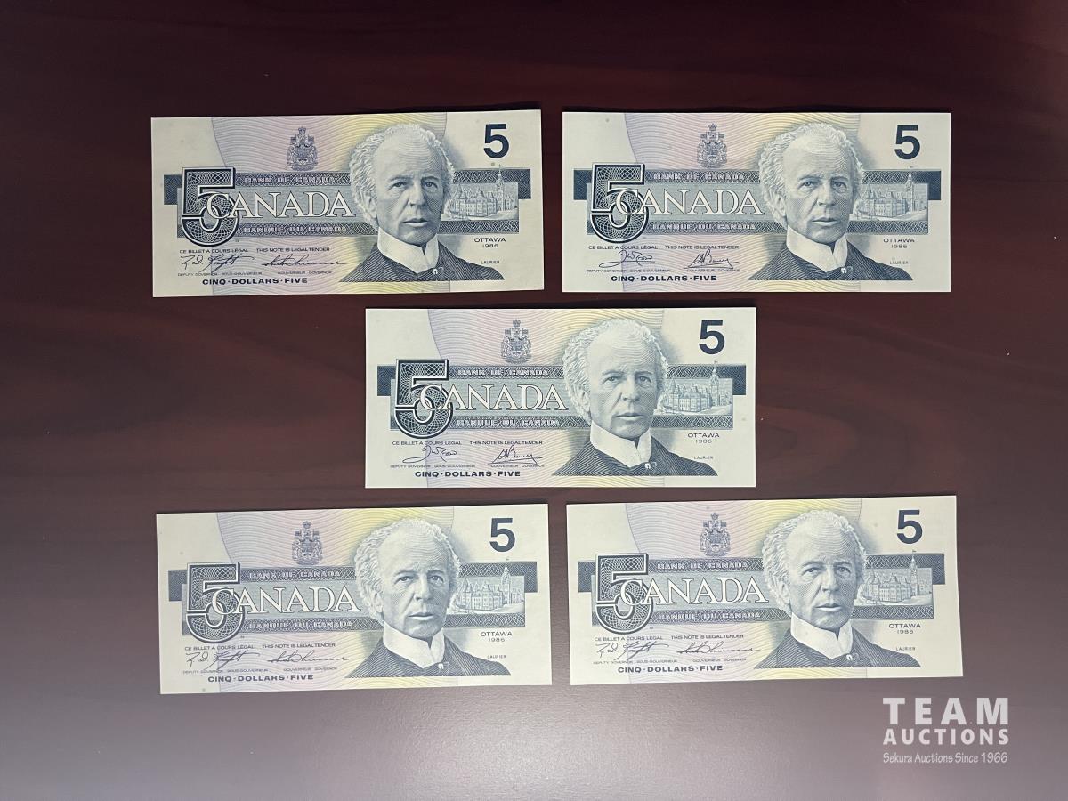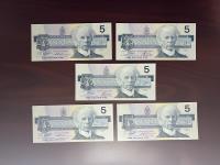 Set of five 1986 five dollar bills.