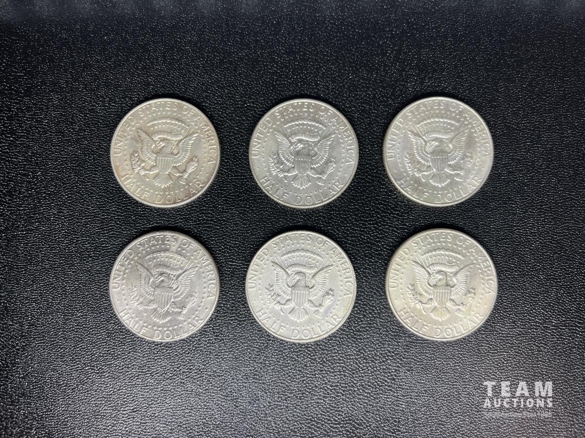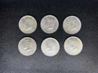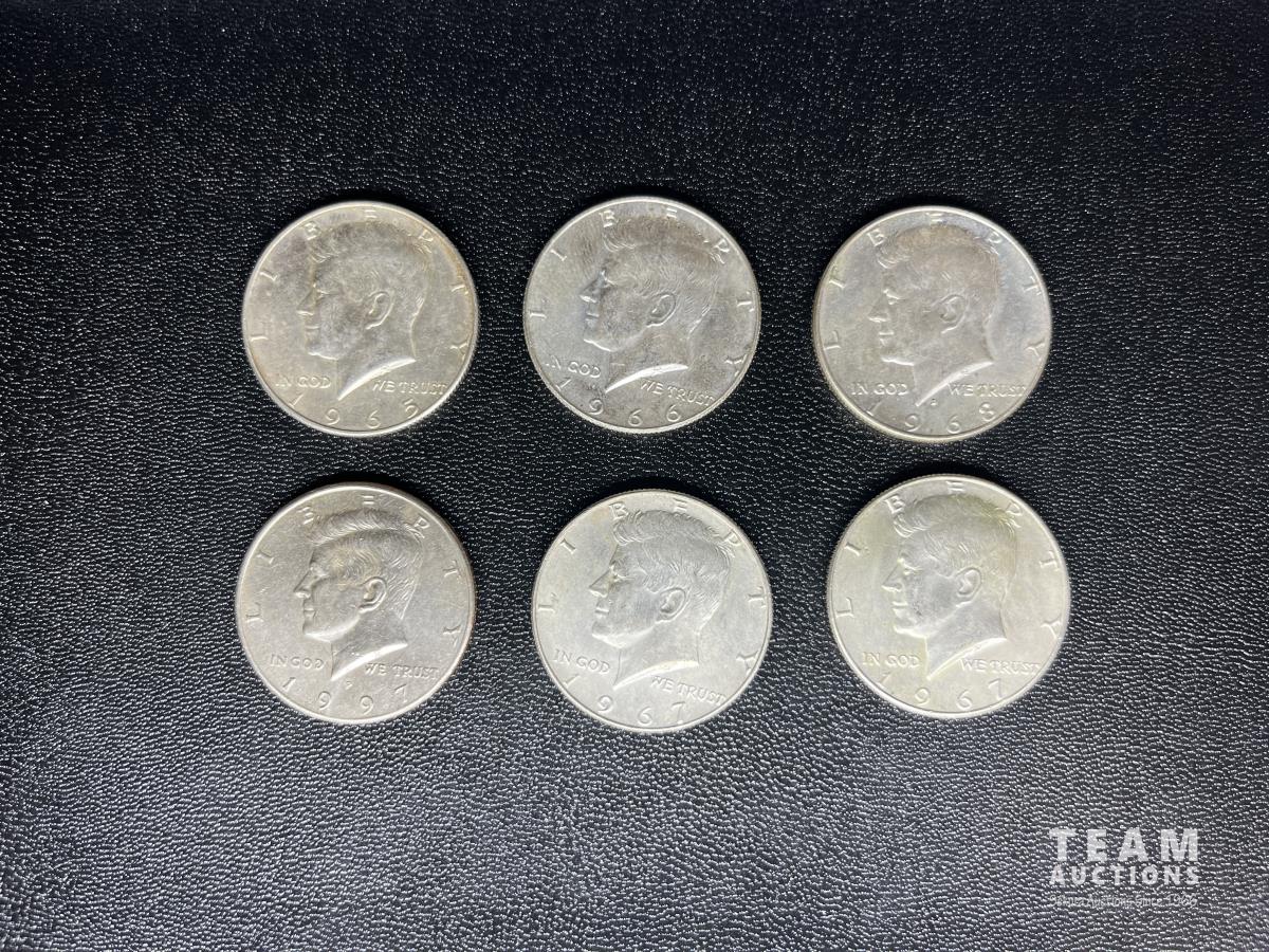 Set of six U. S half dollar silver coins. 1965, 1966, (2) 1967, 1968, 1997