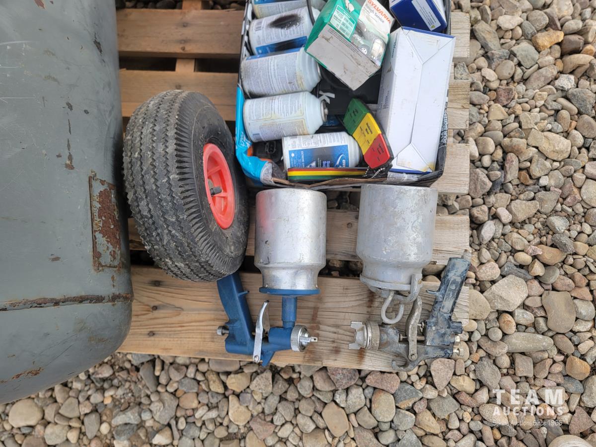 (2) paint spray guns, spray gun with hopper, inoperable compressor, box of miscellaneous. Paint supplies