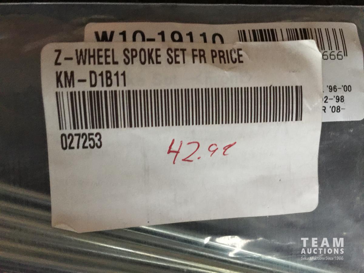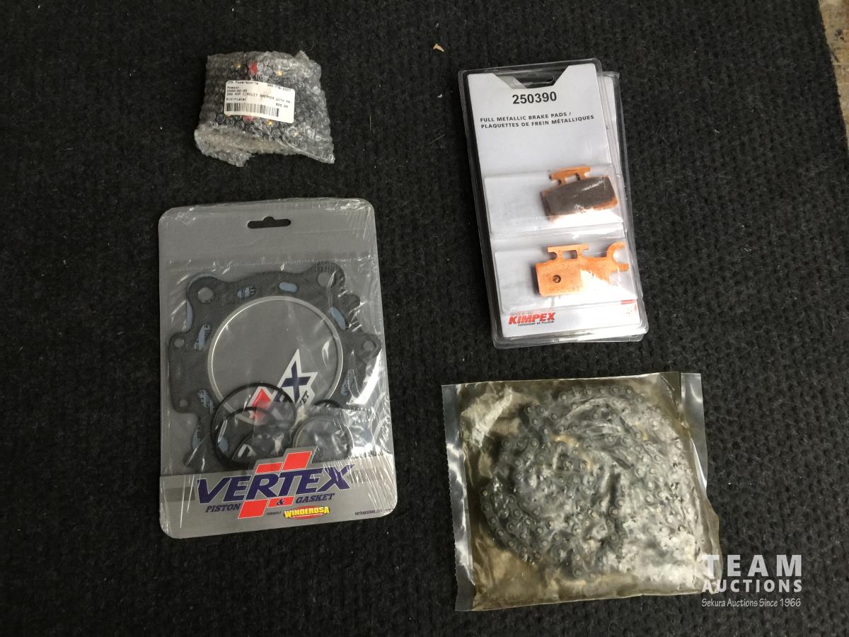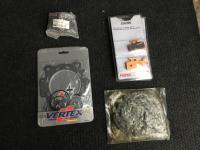 (2) 027253 Z- Wheel Spoke Sets, (3) 250375 Full Metallic Brake Pads (1) Circuit Amp Breaker, (2) 250390 Full Metallic Brake Pads, (1) 217133 Chain, (1) 059327 Top End Gasket Kit