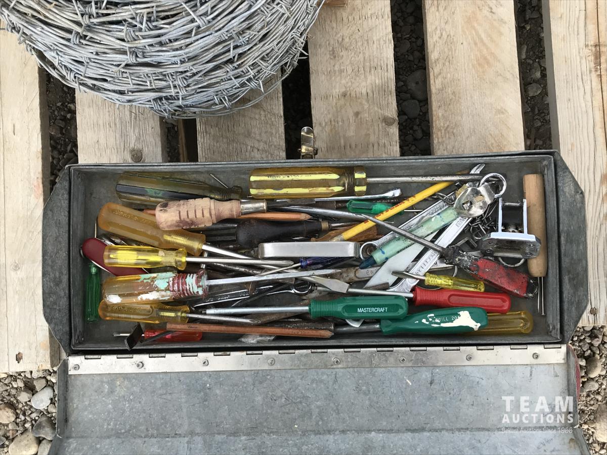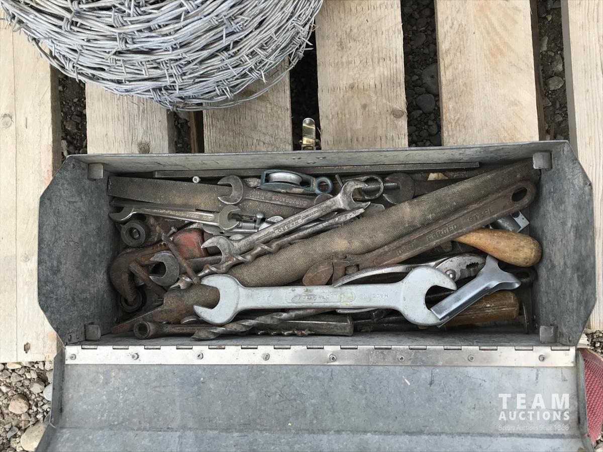 1907 Toolbox w/ Tools, Qty of Barbwire & (2) Fuel Filters