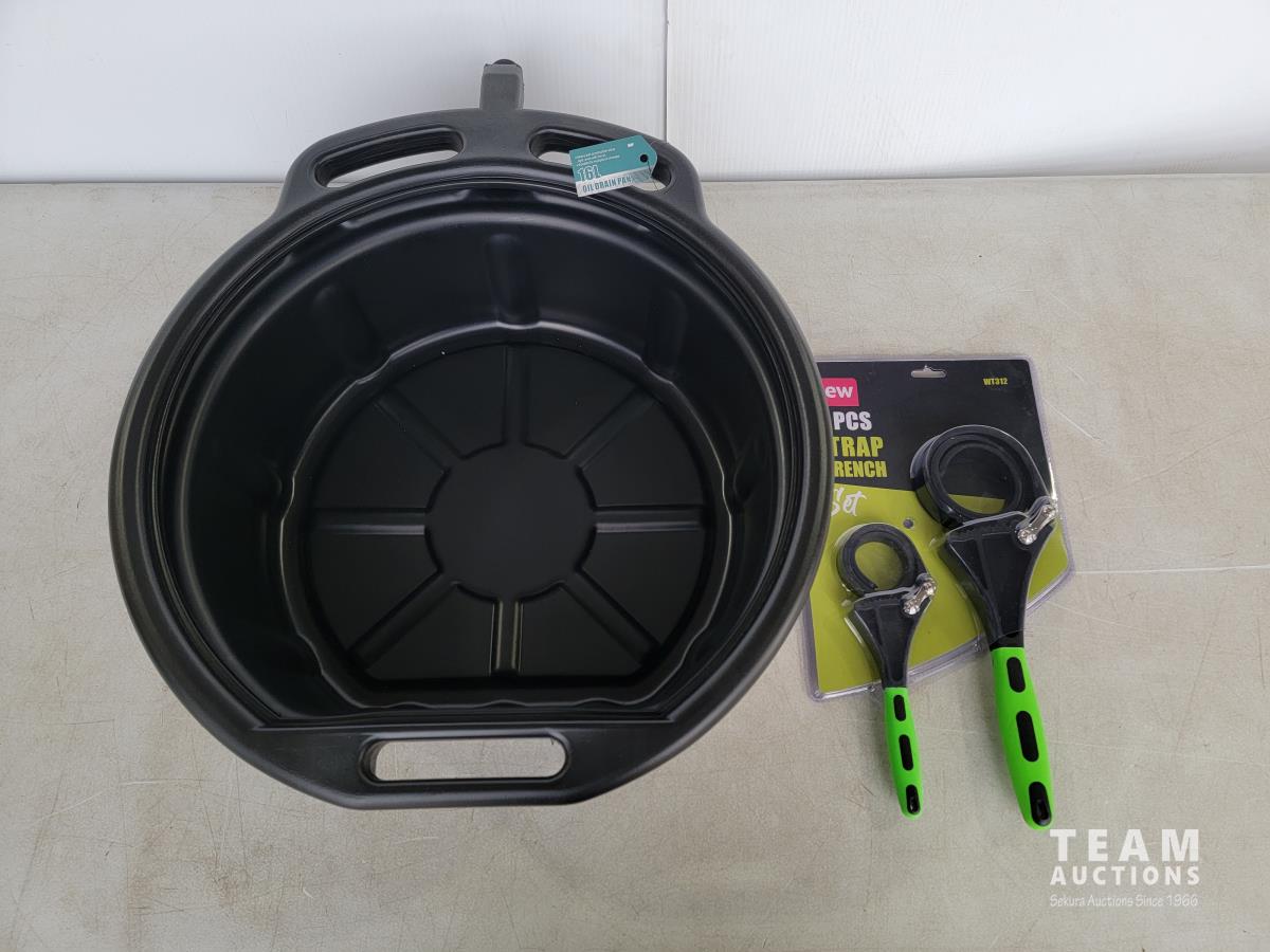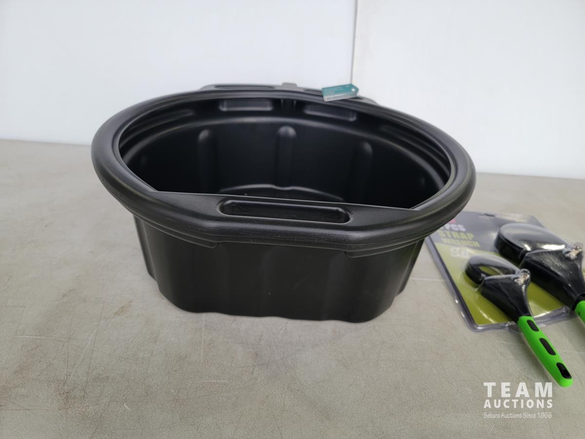 1542 16L Oil Drain Pan and 2 Piece Strap Wrench Set (Unused)