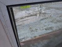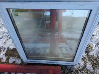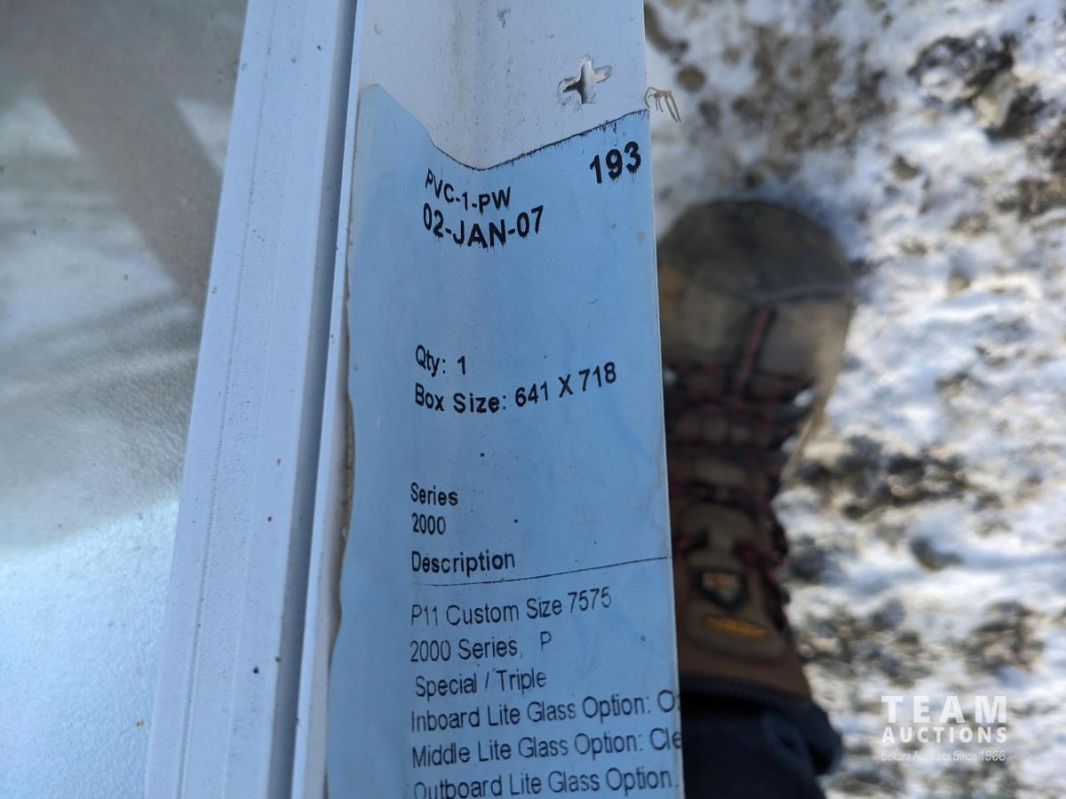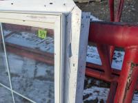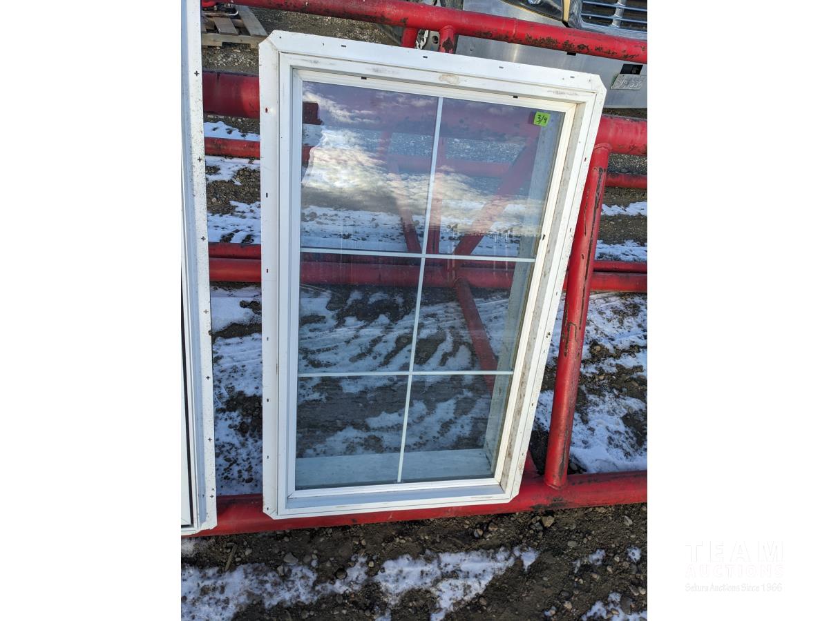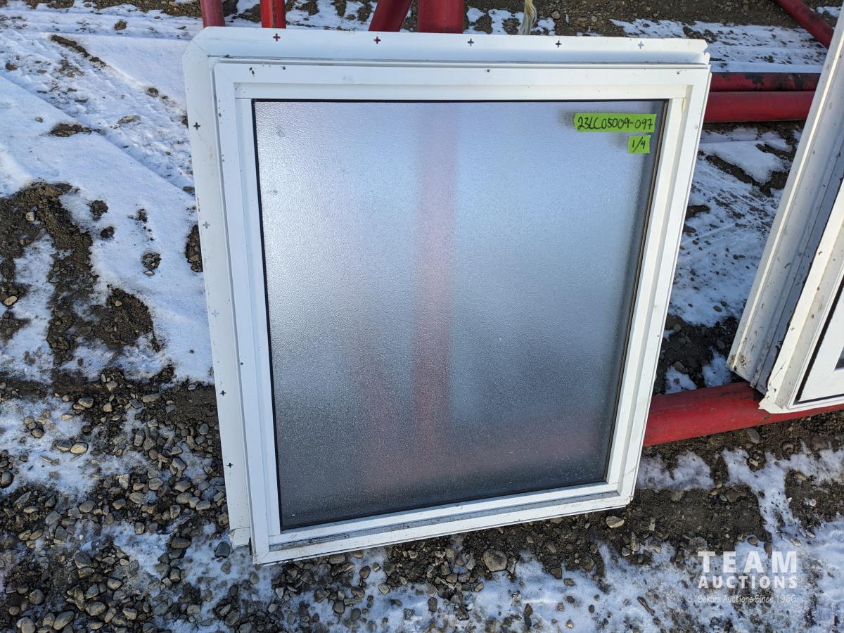 (1) frosted 25-3/16 inch w x 28-3/16 inch h, (1) frosted 25-1/4 inch w x 47-3/8 inch h, (1) clear with pane strips 23-13/16 inch w x 39-1/2 inch h, (1) sliding vinyl with aluminum edge 56-3/8 inch w x 33-3/4 inch h