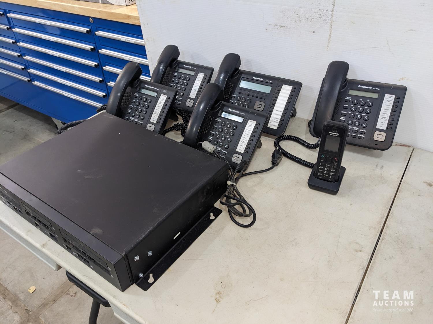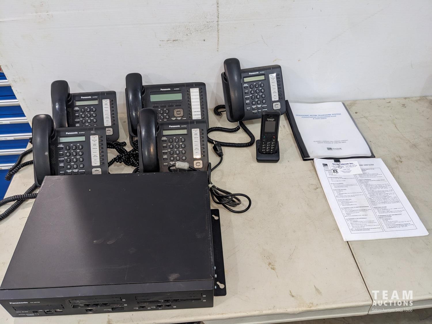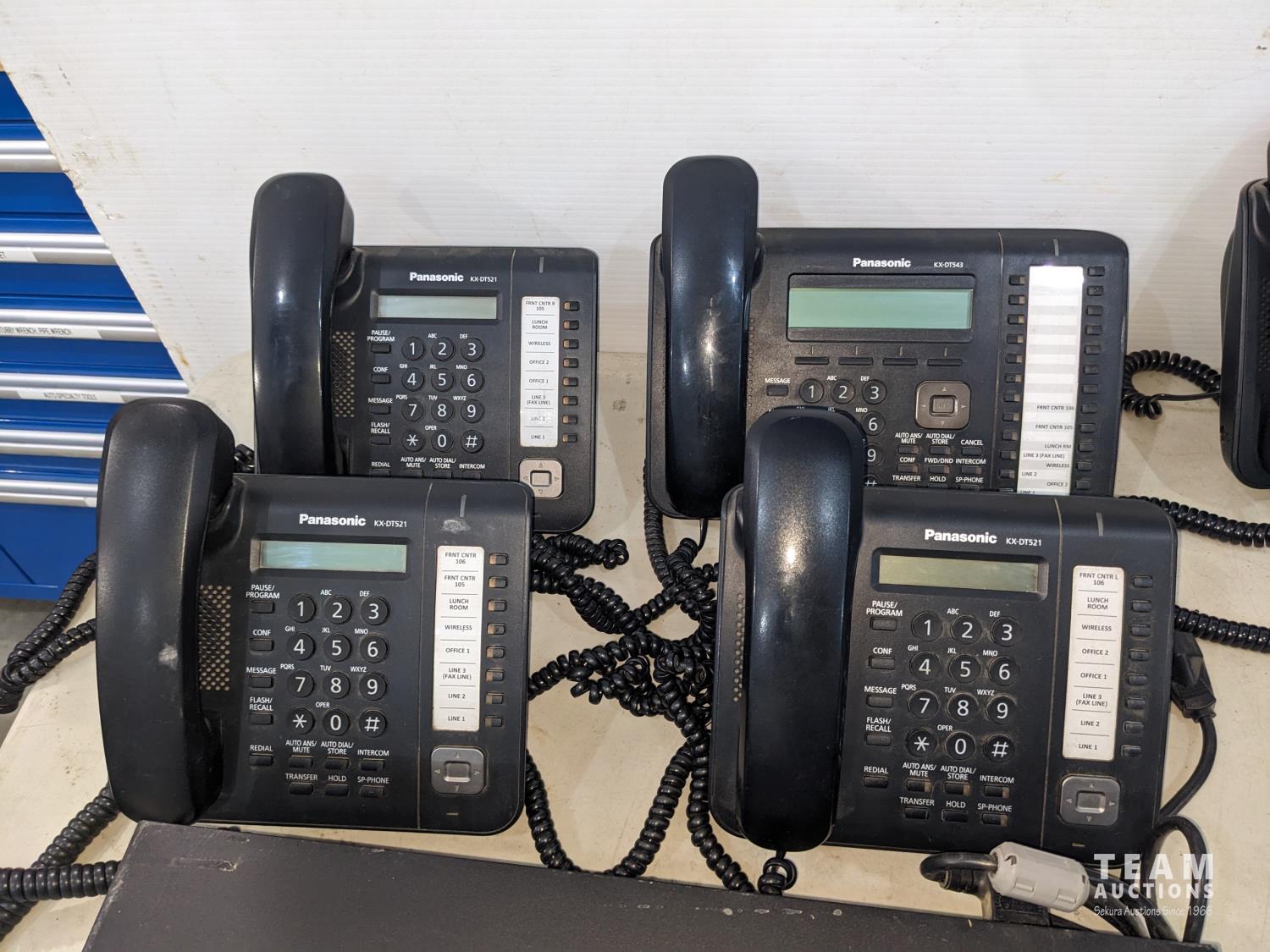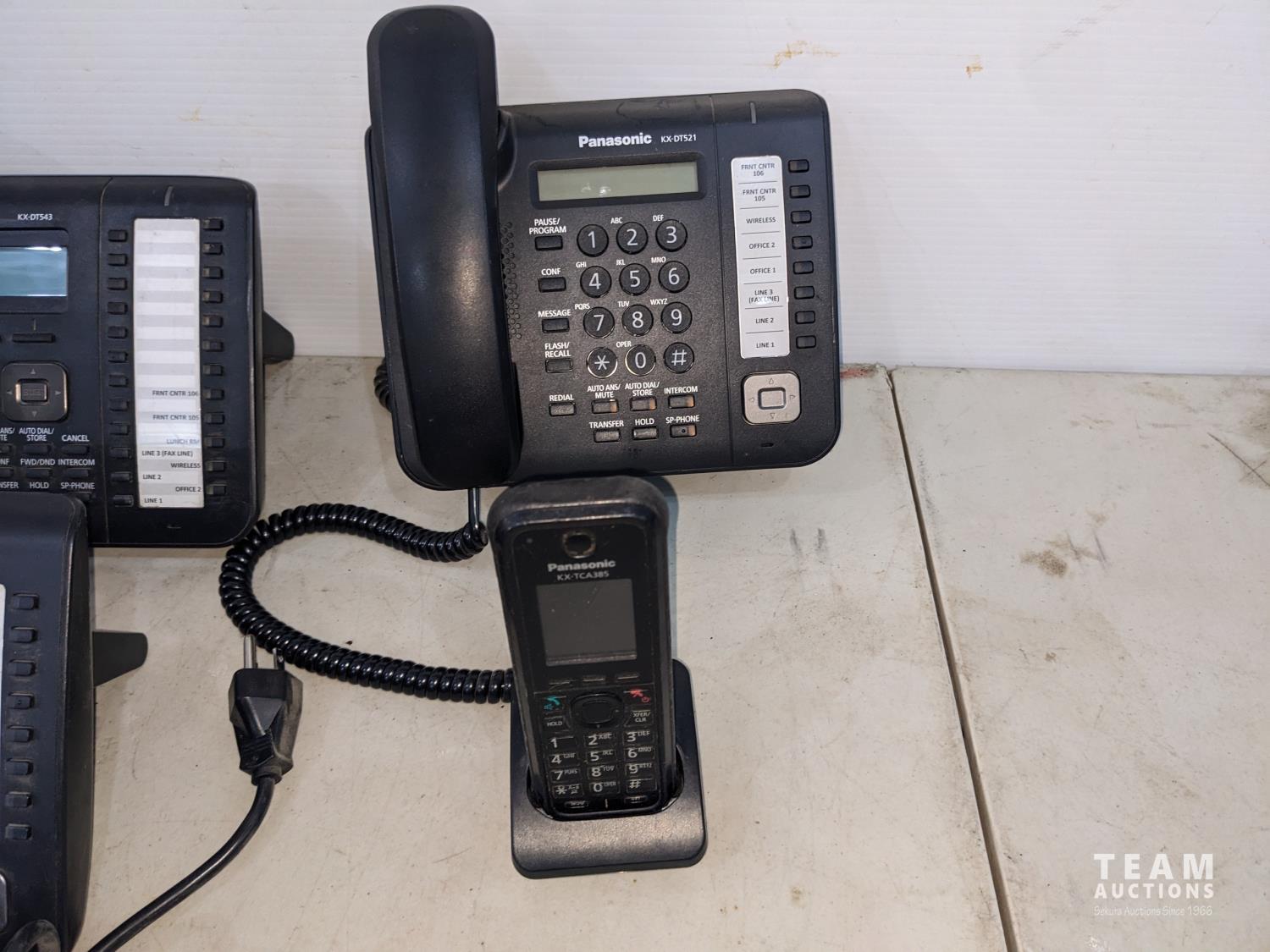 (4) Panasonic KX-DT521 phones, (1) KX-DT543 phone (1) KX-TCA385 cordless rechargeable phone, manuals