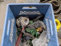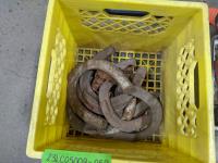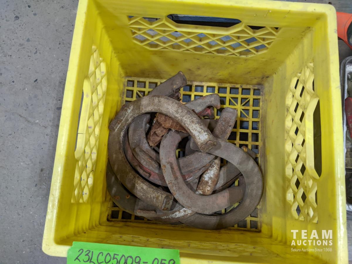 Toolbox with brass fittings, qty of horse shoes, 5 inch x 2 ft flexible metal hose, (2) metal hose