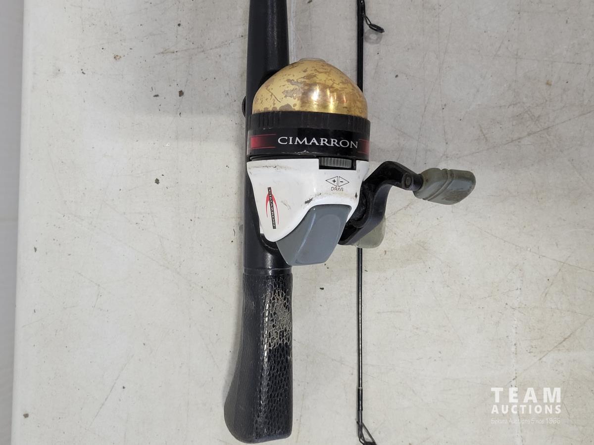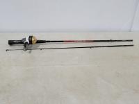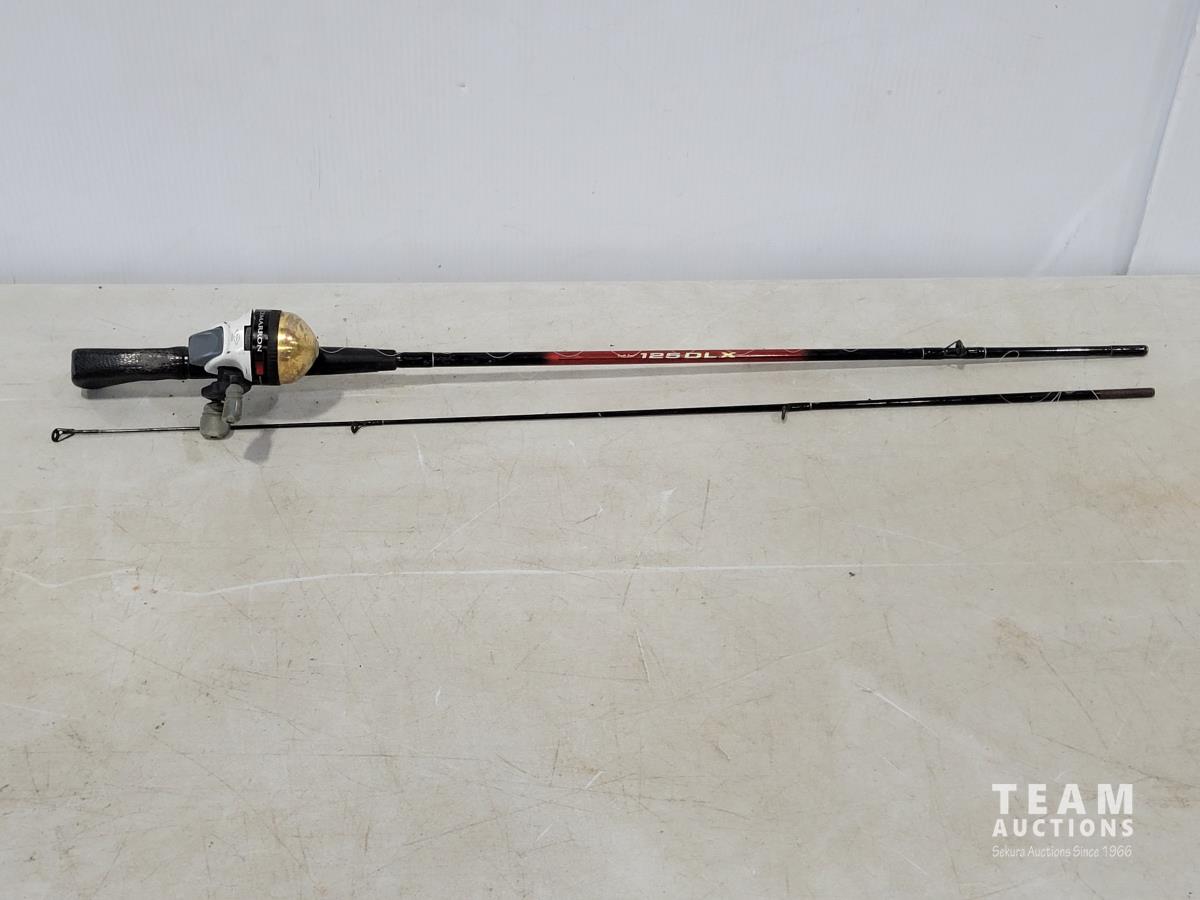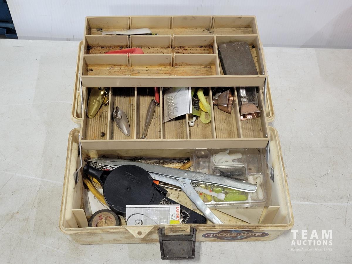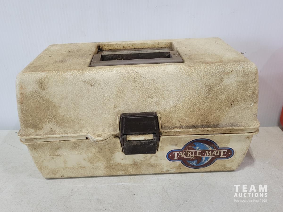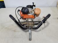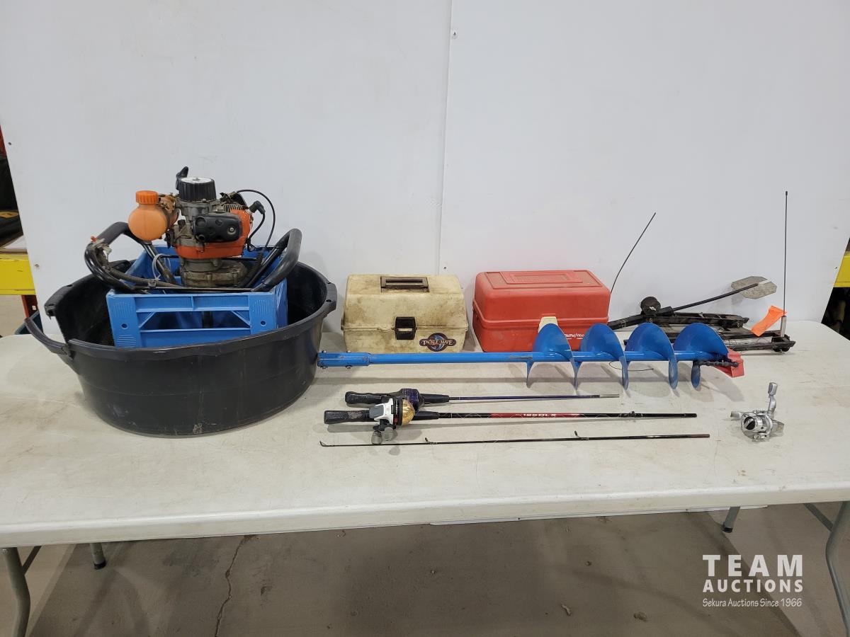 Tanaka TIA-305 6 inch gas ice auger, (2) tackle boxes with contents, (2) spin casting rod/reel combos, (2) Tip-ups