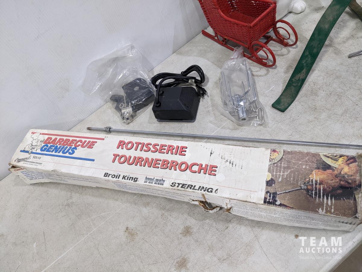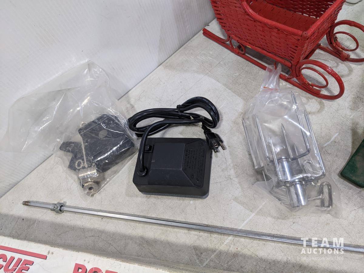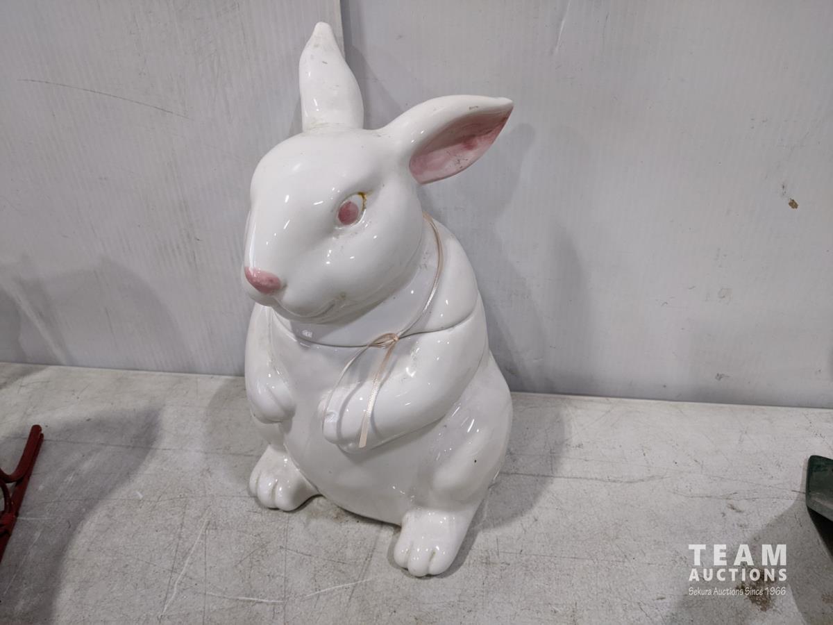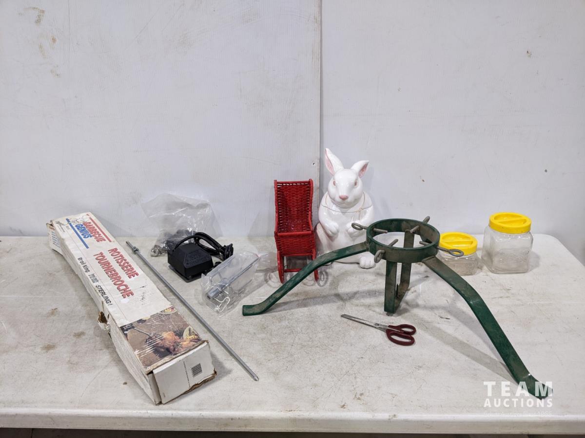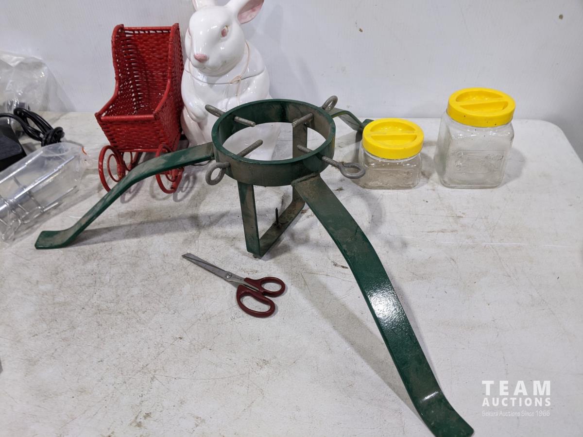 Rotisserie, metal Christmas tree stand, Bunny cookie jar
