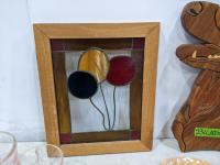 Stain glass picture, German Shepherd wooden art, (3) Fire King measuring cups, (2) Fire King carnival glass plates