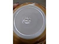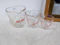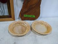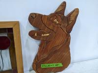 Stain glass picture, German Shepherd wooden art, (3) Fire King measuring cups, (2) Fire King carnival glass plates