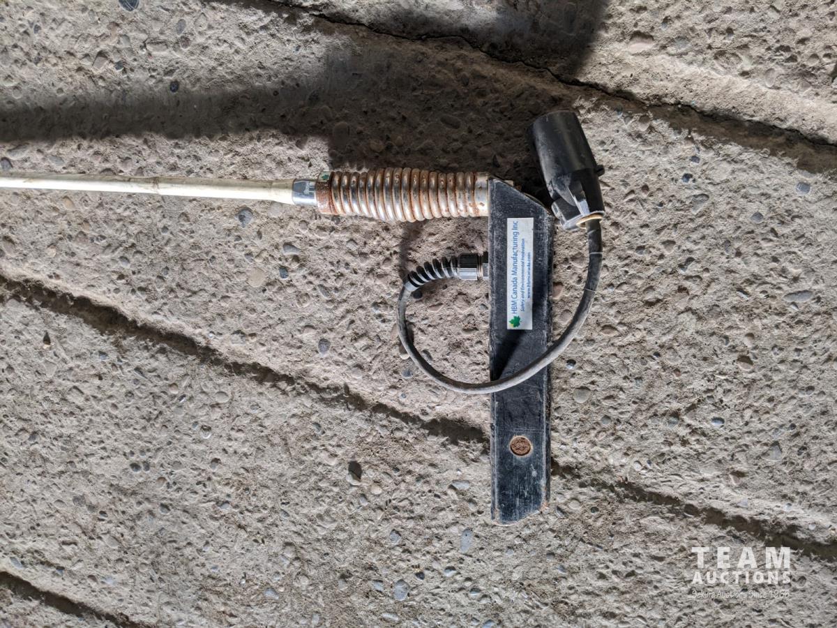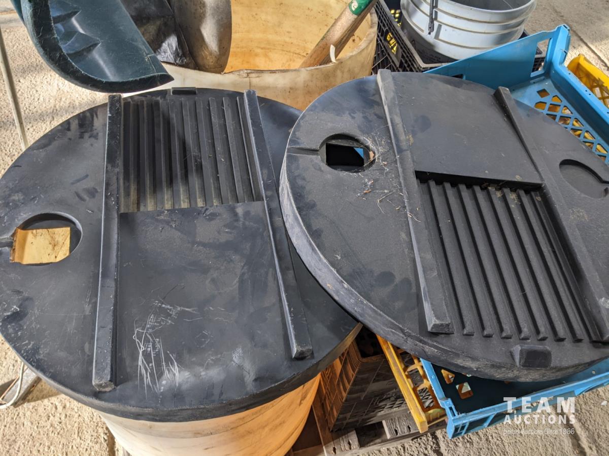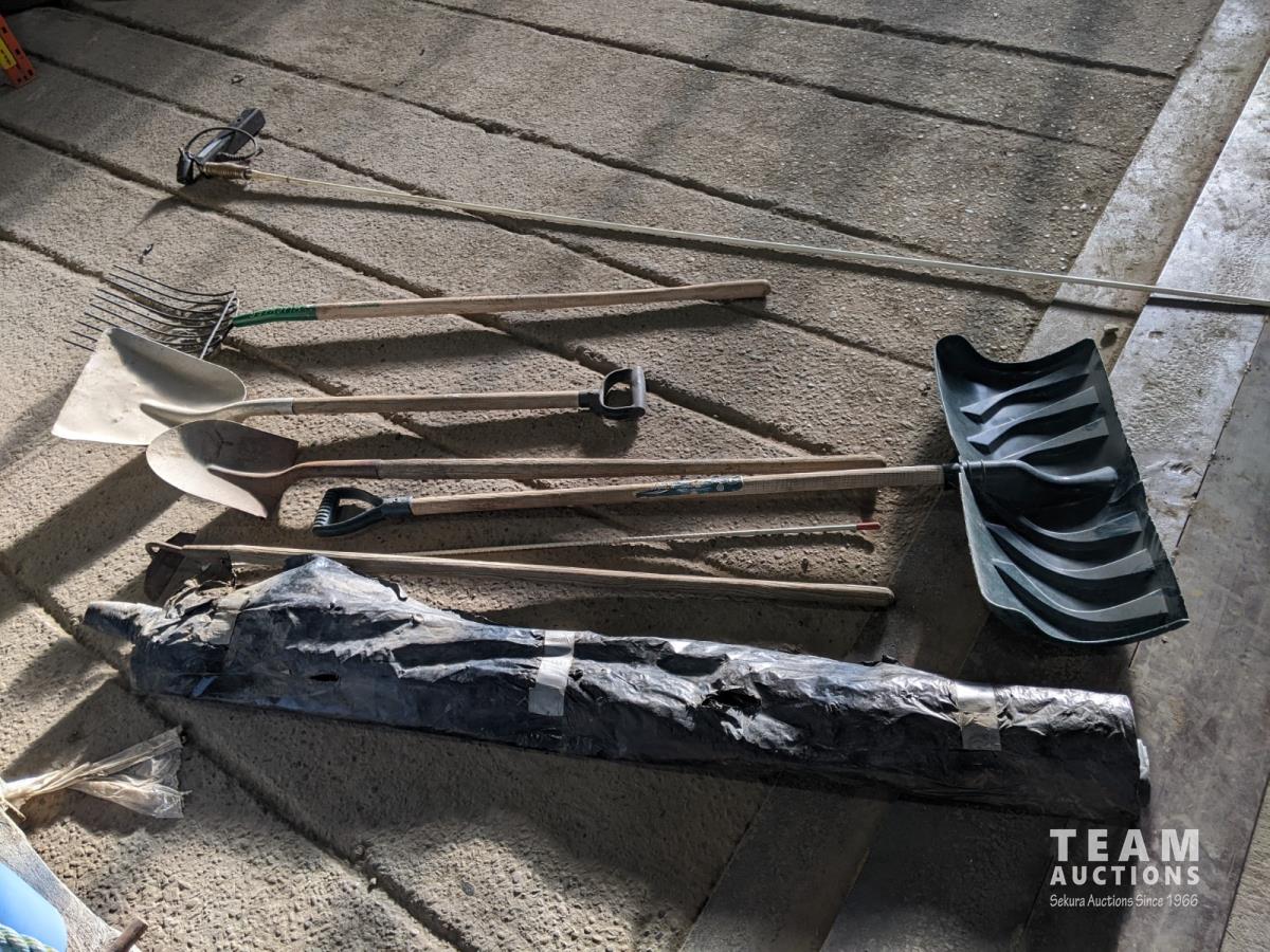 Shovels, hay rakes, pitch fork heads, (2) poly barrels, (2) rain barrel tops, 11 ft buggy whip hitch attachment with trailer plug in