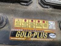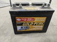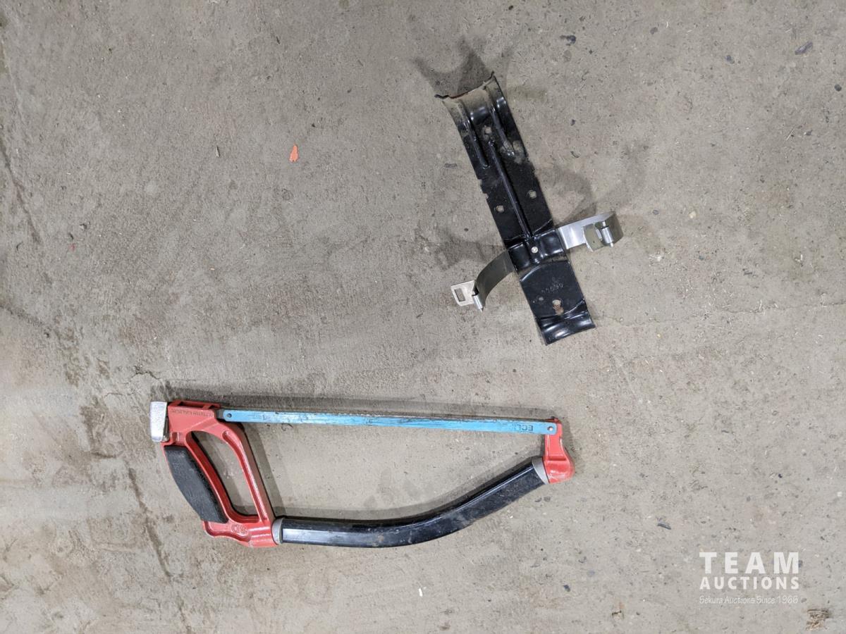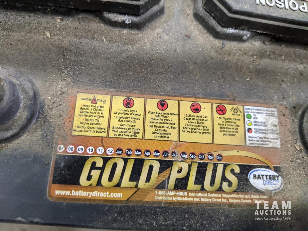 Gold Plus battery, parts, scrap rubber, incomplete spill kit, hacksaw, trailer parts