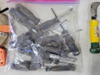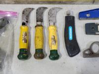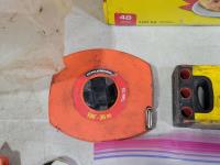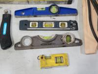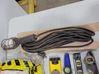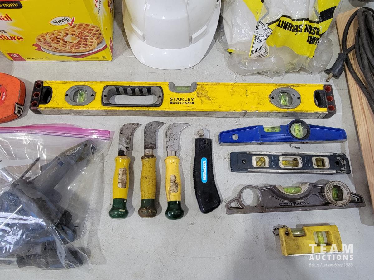 Levels, work light, screwdrivers, hardhats, knives, straight-lines