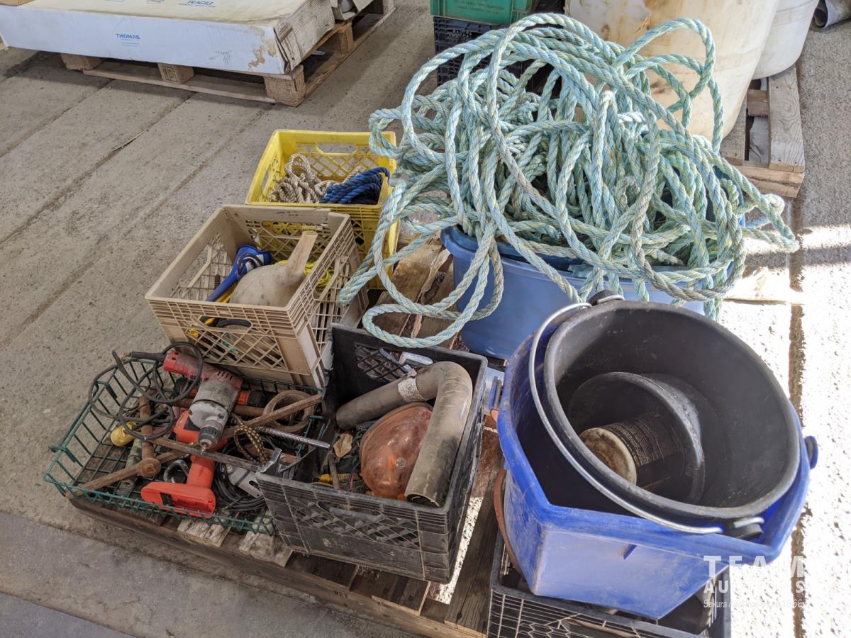 Milwaukee drill, 12V strobe light, ropes, horse tack, feed pails, (4) rolls of solder wire, ratchet straps