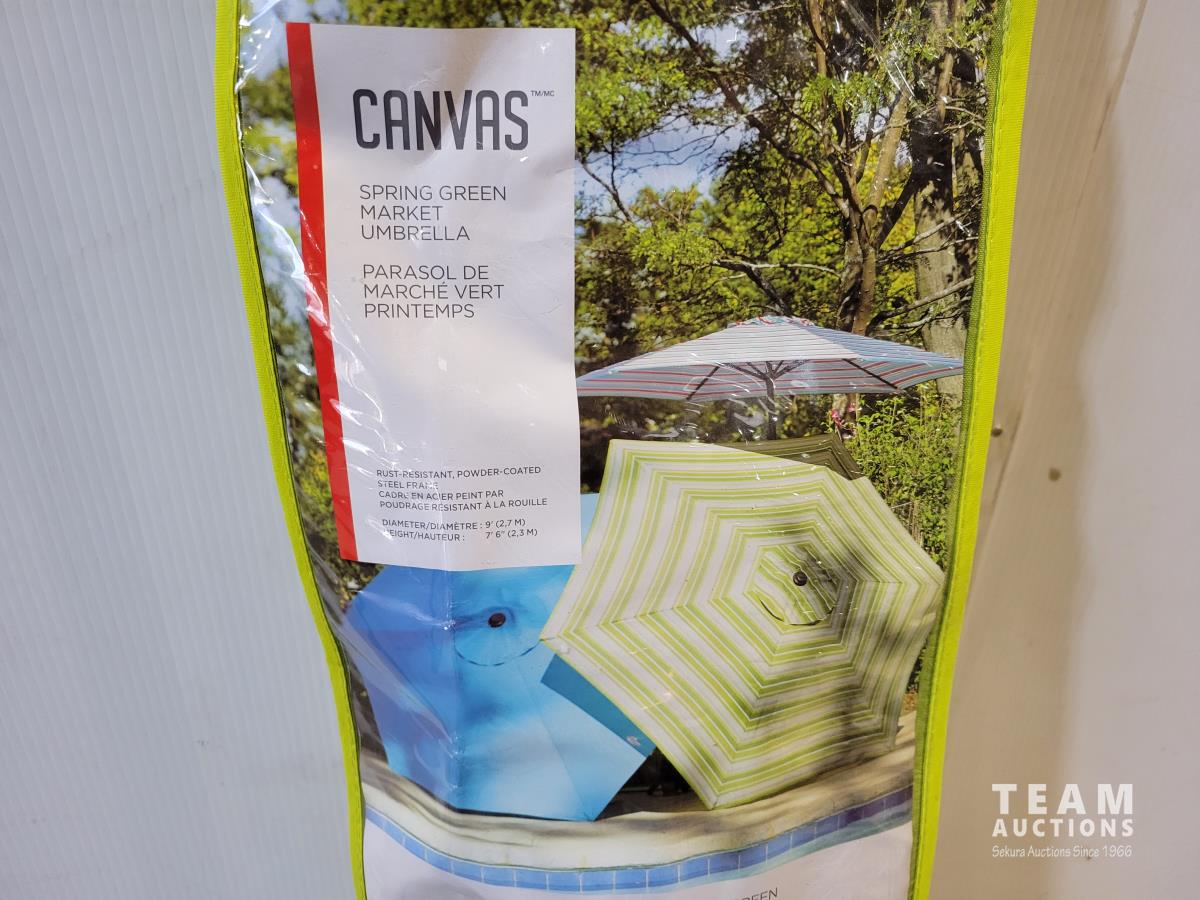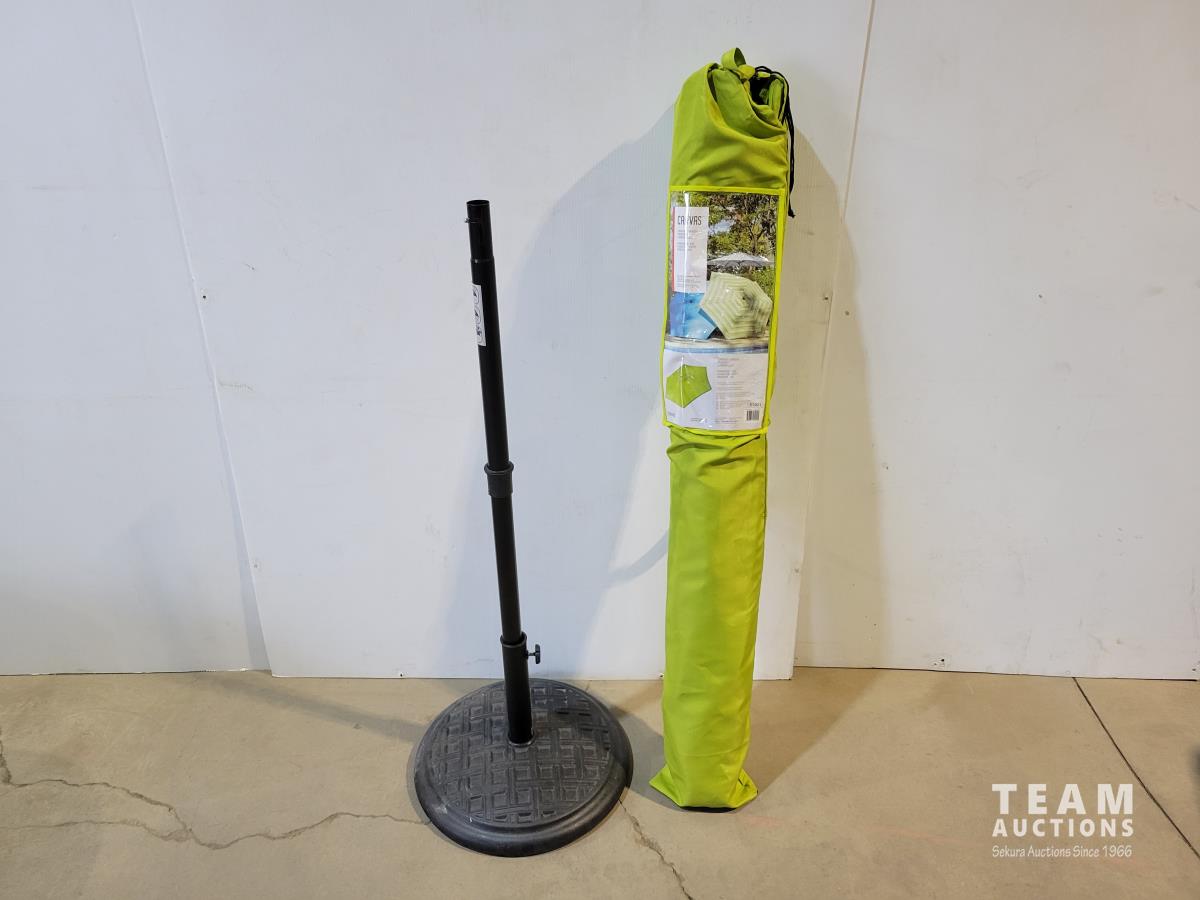 1300 Small Patio Table, Patio Umbrella Stand and Canvas Spring Green Market Umbrella