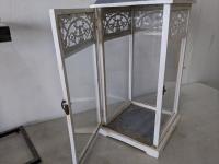 Side table is 13 inch w x 13 inch l x 24 inch h, lantern is 14 inch w x 14 inch l x 36 inch h