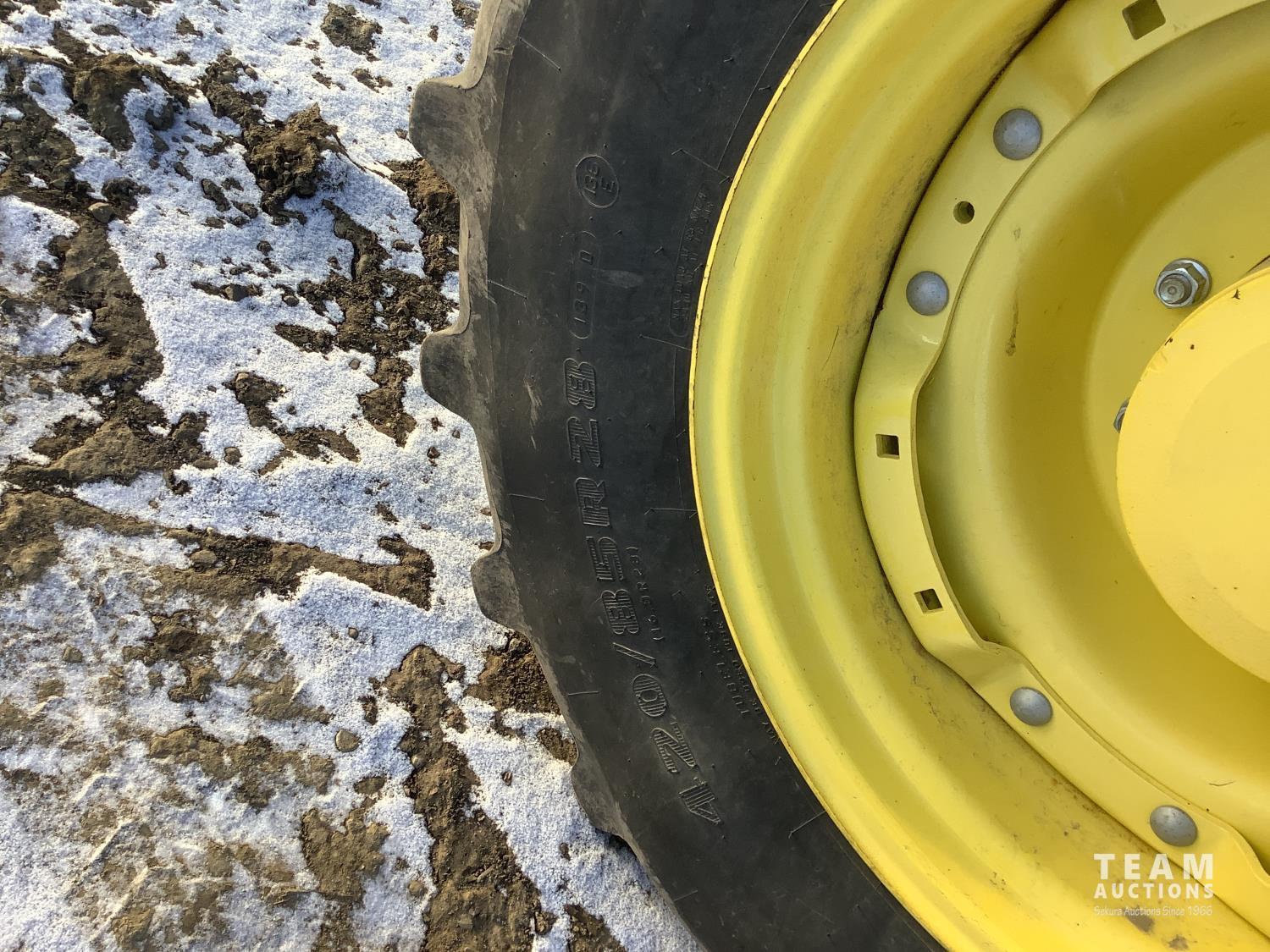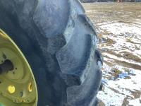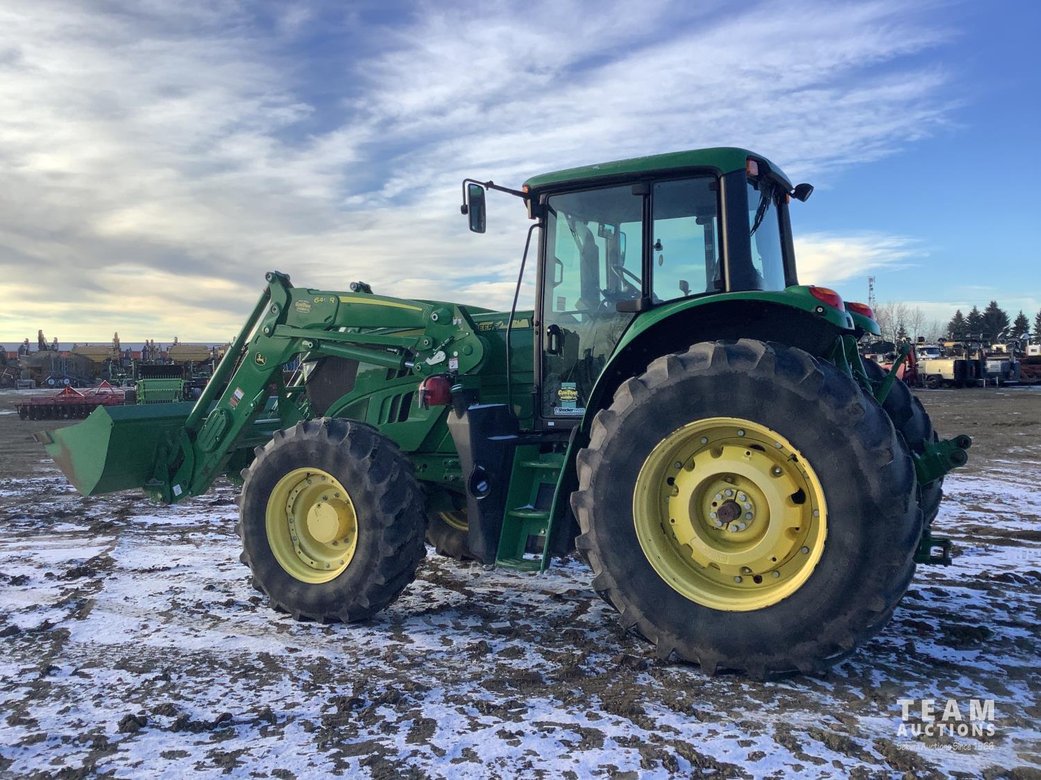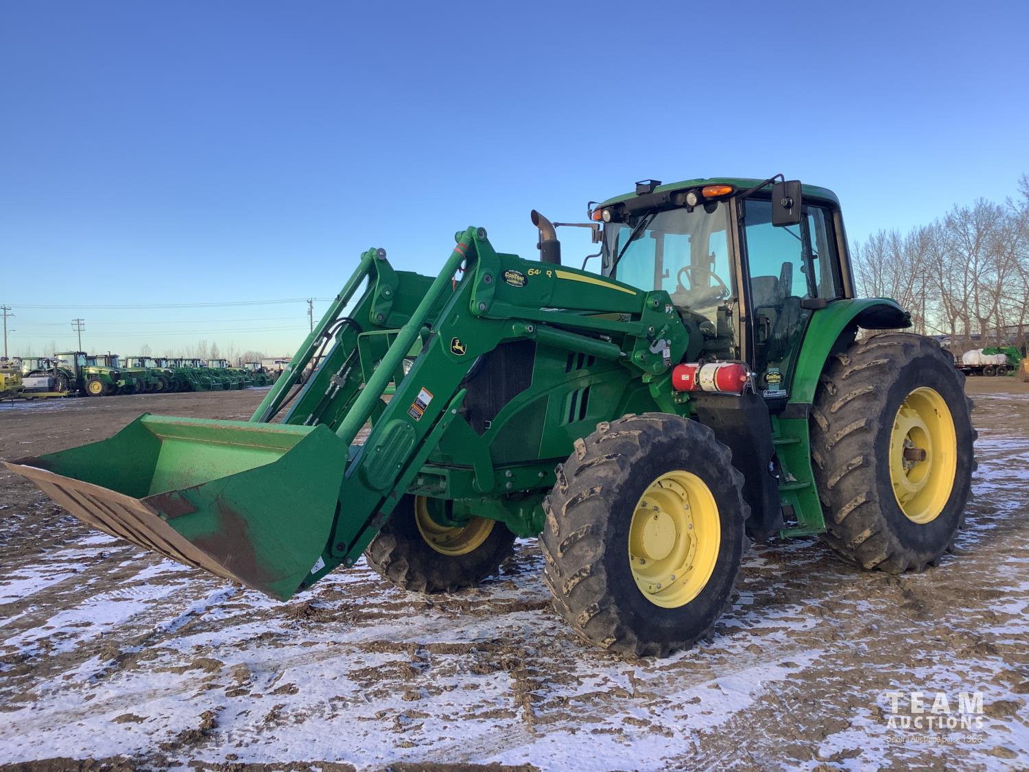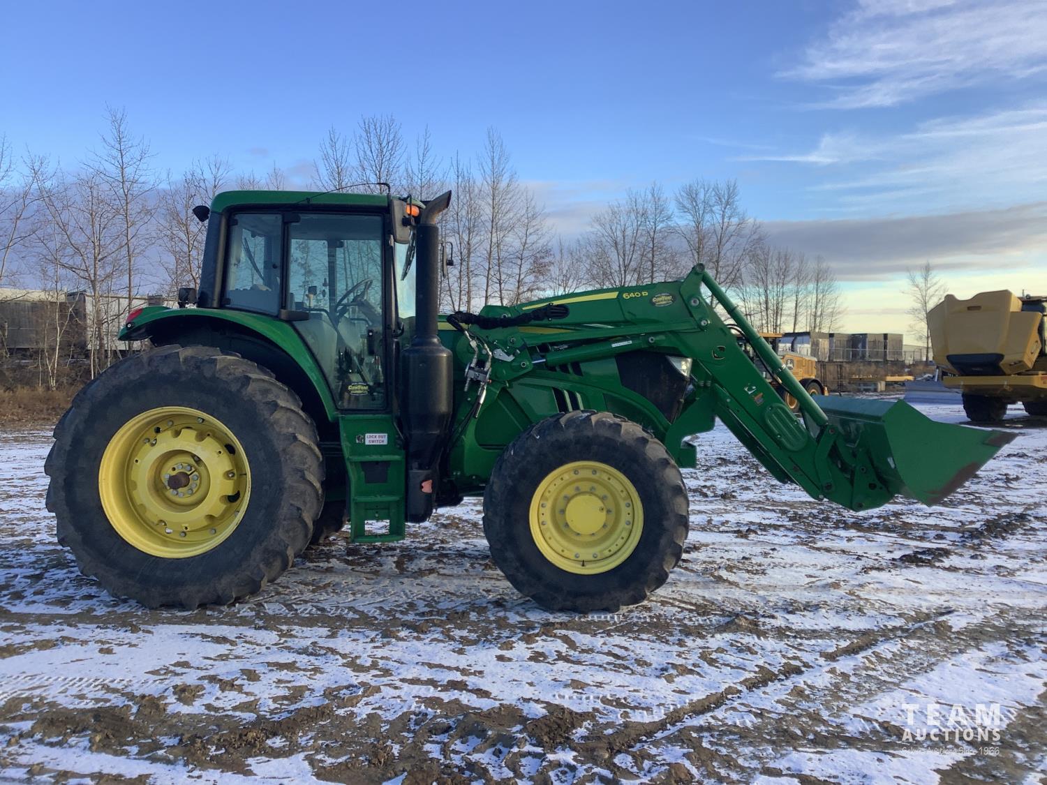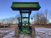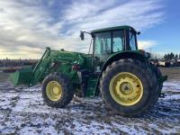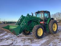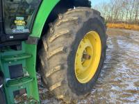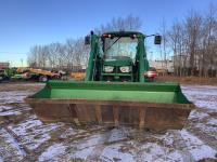 John Deere 640R loader, Q/A, bucket, mid mount hydraulic connection, John Deere 6.8 6 cylinder 155 HP, engine, 123 PTO HP, 20 speed Auto Quad Plus partial power shift transmission, cab, left hand reverser, joystick, A/C, radio, buddy seat, grill guard, 540/1000 PTO, 3 point hitch, 3 rear hydraulic outlets, rear wheel weights, 420/85R28 front tires, 520/85R38 rear tires