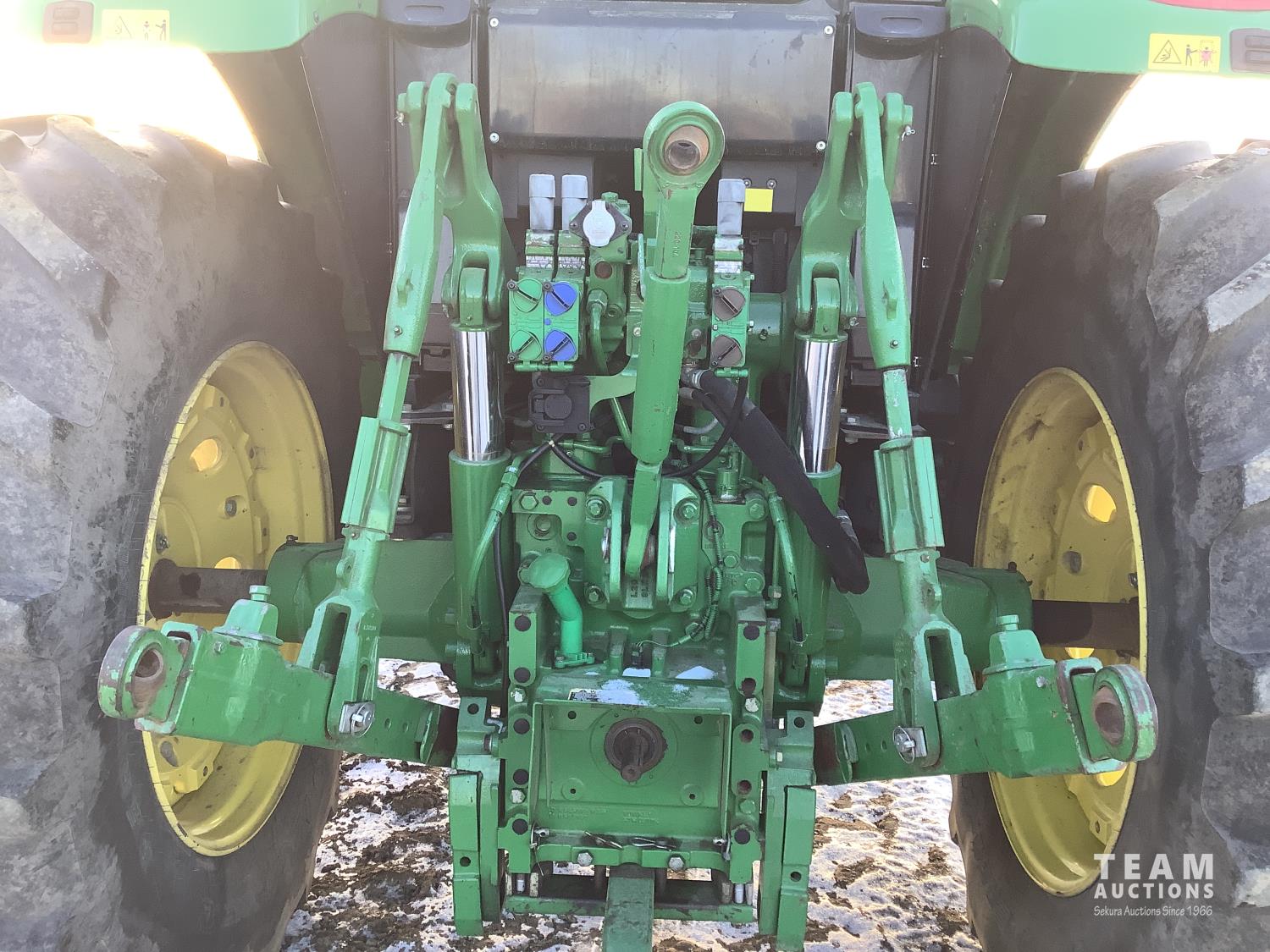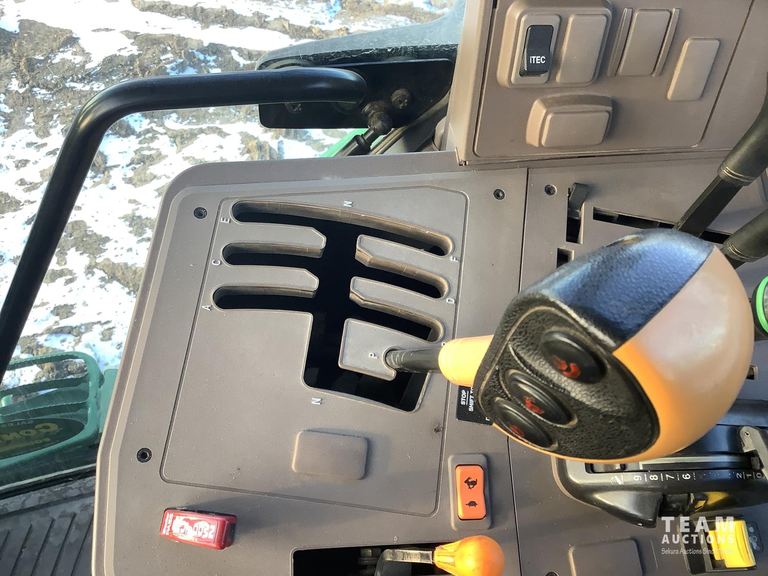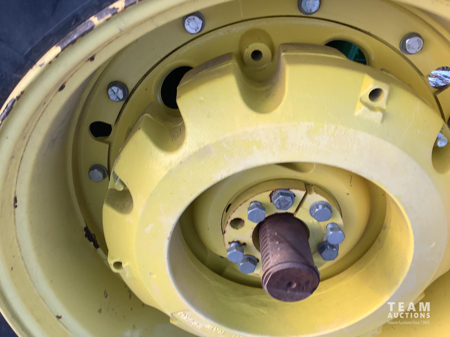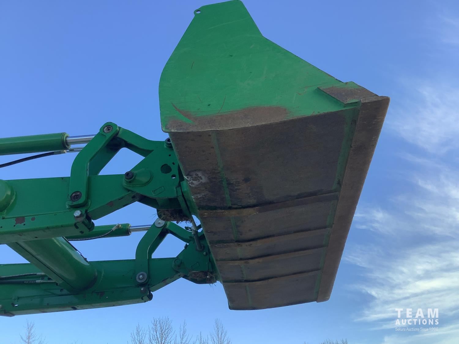 John Deere 640R loader, Q/A, bucket, mid mount hydraulic connection, John Deere 6.8 6 cylinder 155 HP, engine, 123 PTO HP, 20 speed Auto Quad Plus partial power shift transmission, cab, left hand reverser, joystick, A/C, radio, buddy seat, grill guard, 540/1000 PTO, 3 point hitch, 3 rear hydraulic outlets, rear wheel weights, 420/85R28 front tires, 520/85R38 rear tires