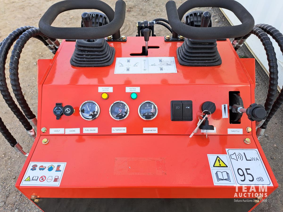 739 cc gas engine, 7 inch wide by 46 inch long tracks, 43 inch quick attach bucket, electric start, comes with battery, has battery disconnect, hrs meter, temperature gauge, 12 volt power outlet, LED lights, joy stick controls, auxiliary hydraulics