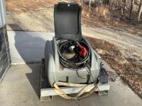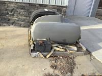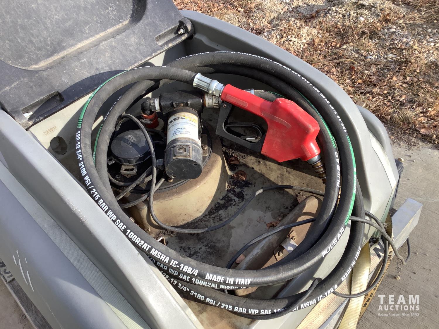 12 volt pump, hose, nozzle, mounted on metal skid frame that can be picked up with pallet forks to be moved around