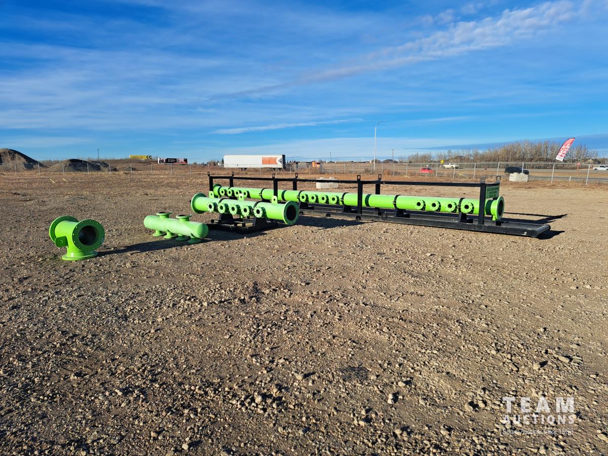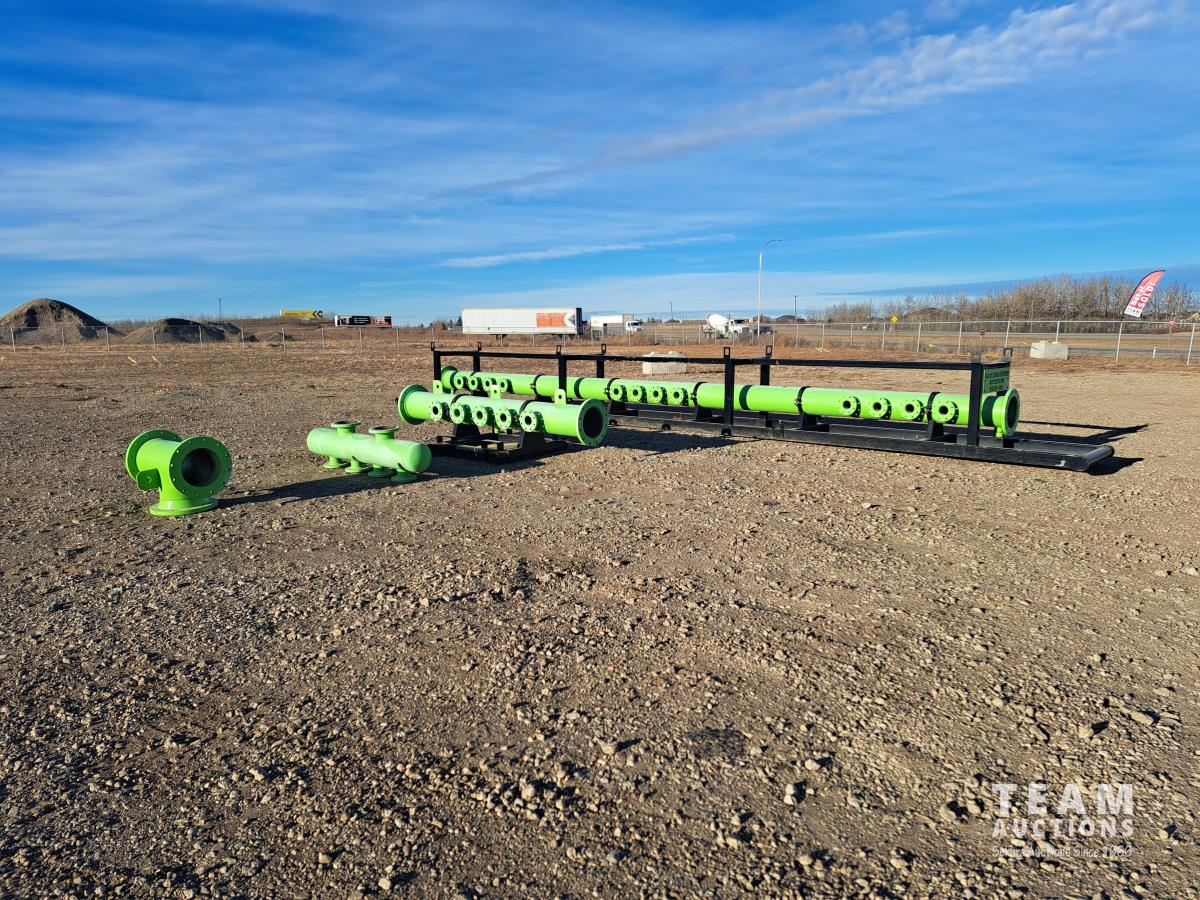 (1) - 35 ft long skids c/w 30 ft of manifold. 24 side outlets, 8 bolt 4 inch 150 and 12 inch 150 flanges, lifting hooks